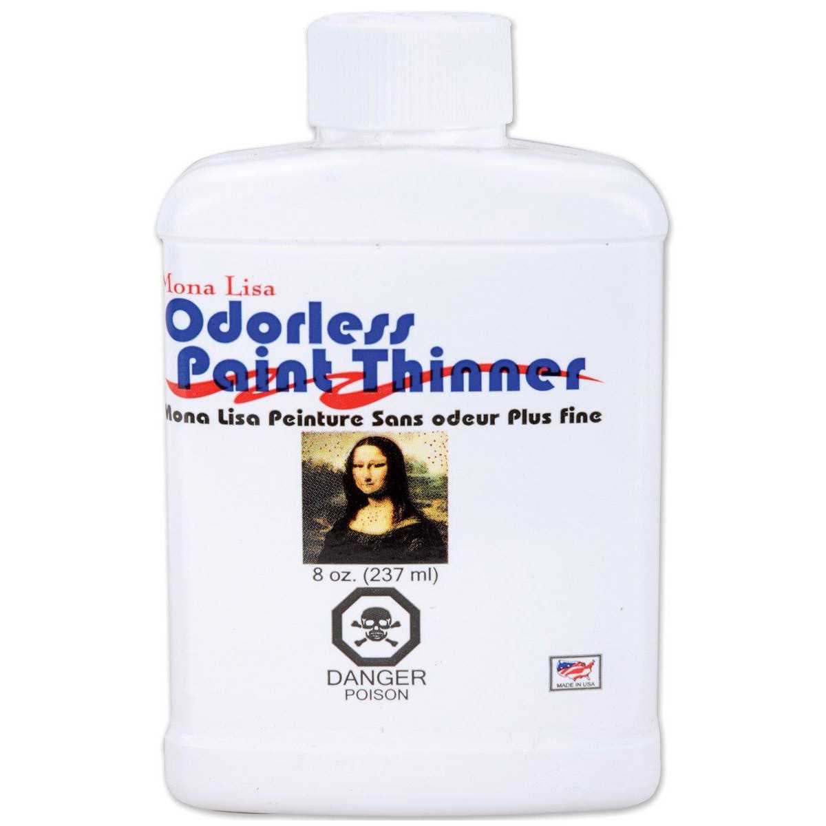 Thinner is used in all types of artist oil, oil Based paints, and varnishes It can be used like turpentine with no unpleasant odor It contains 100 percent odorless mineral spirits Product is combustible and harmful if swallowed Packaged in a Shatterproof 8-ounce bottle with a child Safety locking cap SPEEDBALL-Mona Lisa Odorless Thinner. For use in all types of artist oil, oil based paints, and varnishes. A great brush and accessory cleaner. Can be used like turpentine with no unpleasant odor. Contains 100% Odorless Mineral Spirits. Product is combustible and harmful if swallowed. Packaged in a shatterproof bottle with a child safety locking cap. 8 fluid ounces (237ml). Made in USA.