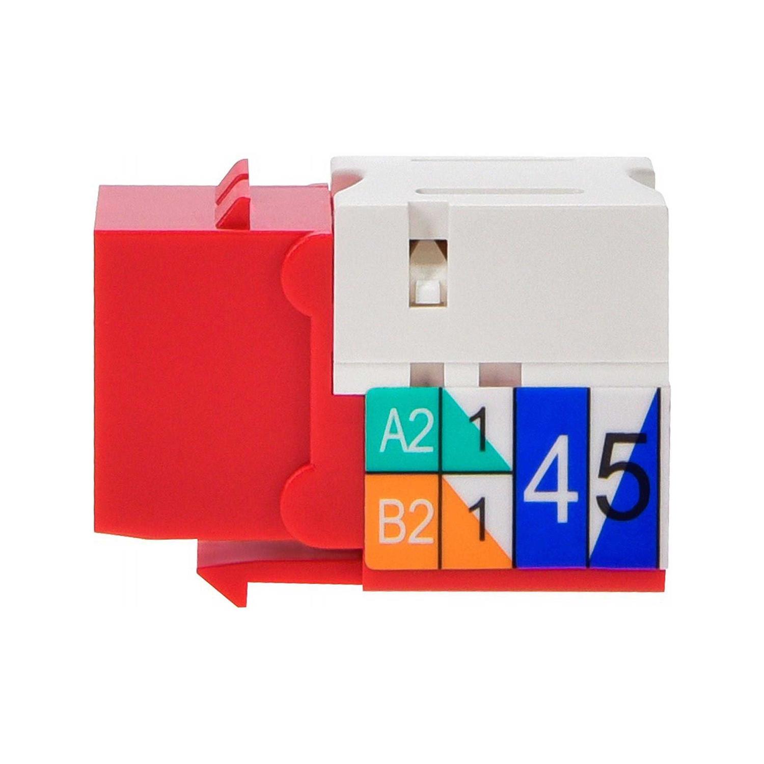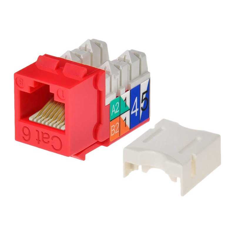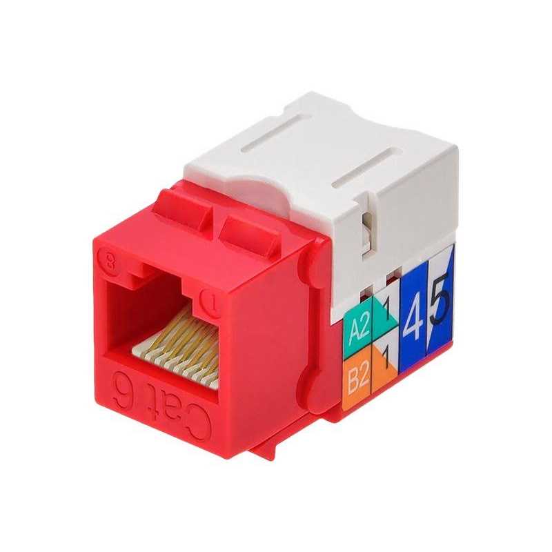 Cat6 Punch Down Keystone Jack – Red High speed, Cat6 grade, easy to use, modular Rj45 Keystone jack. 110 type Idc. 90 degree connection. To be used with keystone wall plate or panel. Wiring diagram next to wire clips. Note that the width of the Rj45 keystones is such that two cannot be used side-by-side in the same wall-plate.