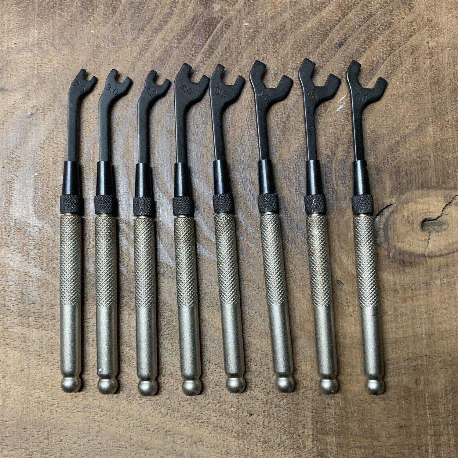 Made in the USA! These high-quality miniature wrenches are offered in sought-after small sizes. Moody Brand Acu-Min Multi-Steel handle with 30 degree offset. 4 inches long. Set includes vinyl storage pouch.