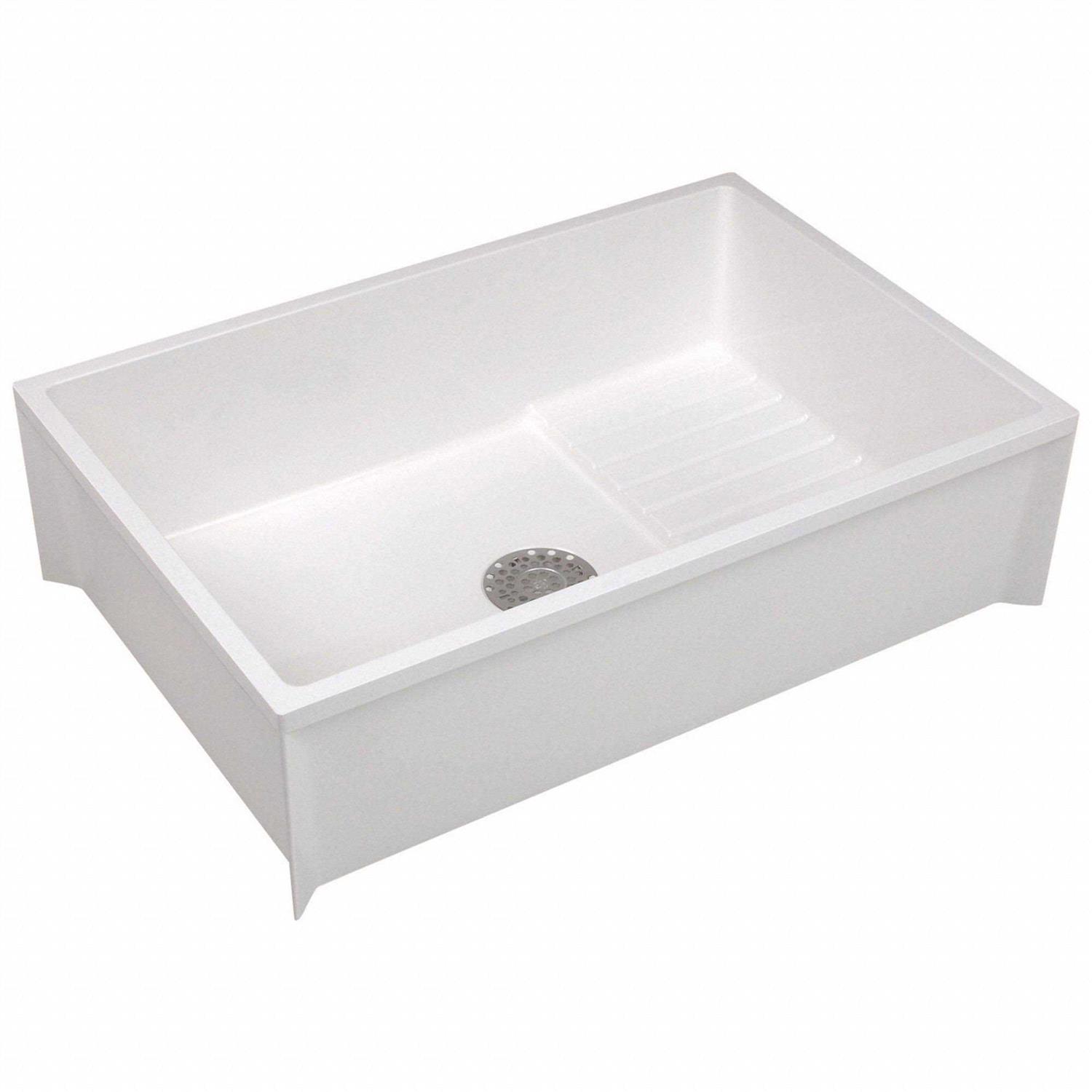 Model 65M mop service basin features one-piece molded from high impact resistant Durastone fiberglass elevated self-draining shelf and removable strainer integral molded-in drain with seal for 3 In. ABS PVC or cast iron pipes and available drain seal for connecting 2 In. pipe or 3 In. soil pipe. IAPMO and Warnock Hersey listed and ANSI specification Z 124.6 approved. Comes in white color and has numerous accessories available.