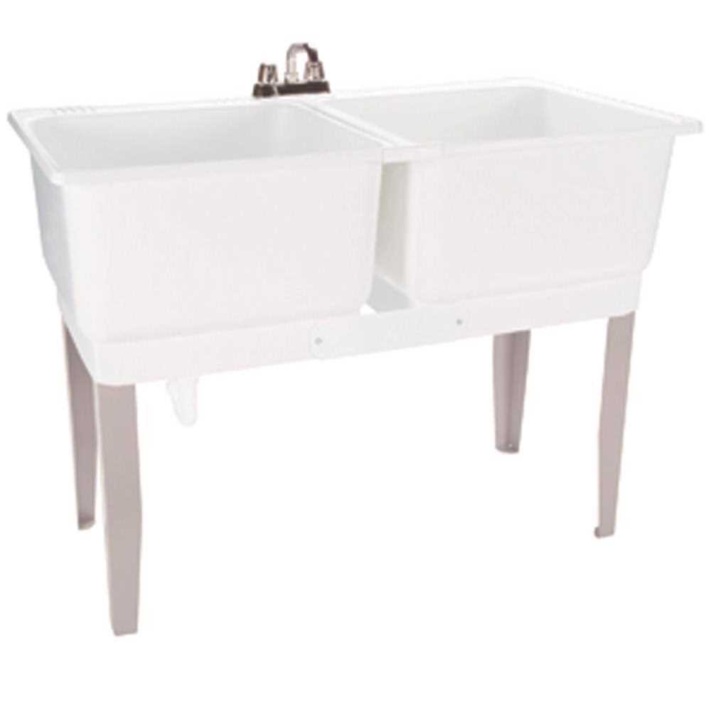 The MUSTEE 46-inch x 34-inch Plastic Laundry Tub features heavy gauge steel legs with adjustable levelers for sturdy use. Each tub basin has a 76L capacity and is leak proof for added convenience. The basins also have integrated drains and mildew-resistant surfaces that you can easily clean.