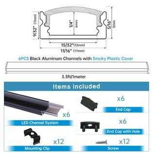 Classic Style- U1SW is a regular led strip channel with 0.5″ inner width and 0.25” height. It fits most light strips with width less than 12mm, such as 3528, 5050, 5630, 2835, etc. This black channel with smoky black cover not only increases lighting visibility, but also provides a clean and elegant look with a slim design Wide Applications- The LED Channel System could be applied in indoor or outdoor lighting decoration such as cabinet, wardrobes, mirrors, ceiling, garage, windows, TV walls, skirting lines, bars, etc. You could also use that to decorate weddings, parties, festivals like Christmas, Halloween, and New Year Easy Installation- The led covers can be simply pressed into channels. They can be cut into lengths effortlessly by a fine-tooth hacksaw. Building a longer lighting project, please search Muzata U1SW 2M for 6.6ft LED channel or LCB1 for extension connectors, Search LCC1 for L-shape corner adapters, Afraid of the light leaking caused by seams, search LC03 to find continuous cover Personalized Choices- Smoky diffuser lets about the same amount of light thru as the clear, reducing glare a bit, but without astigmatism. LED channels with the best spotless effect in the market- Muzata U108, bendable LED channel- Muzata U106, fits waterproof light strips- Muzata U103, V-shaped channel- Muzata V1SW, plaster-in channels- Muzata U117, silicone channels- Muzata LS3,need a premium lighting effect you can search Muzata LED strip (B0BQM3Z731/B0BQM6V1RF) Quality Guarantee- Muzata aluminum LED channel is anodized extruded, great in heat dissipation, while the LED cover protects the LED strip from dust and physical contact, prolonging the lifespan of light strips. This package includes 6pcs LED channel, 6pcs LED cover, double end caps, mounting clips and screws. Each black led channel segment is 1M (3.3ft), total is 6M/19.8ft.
