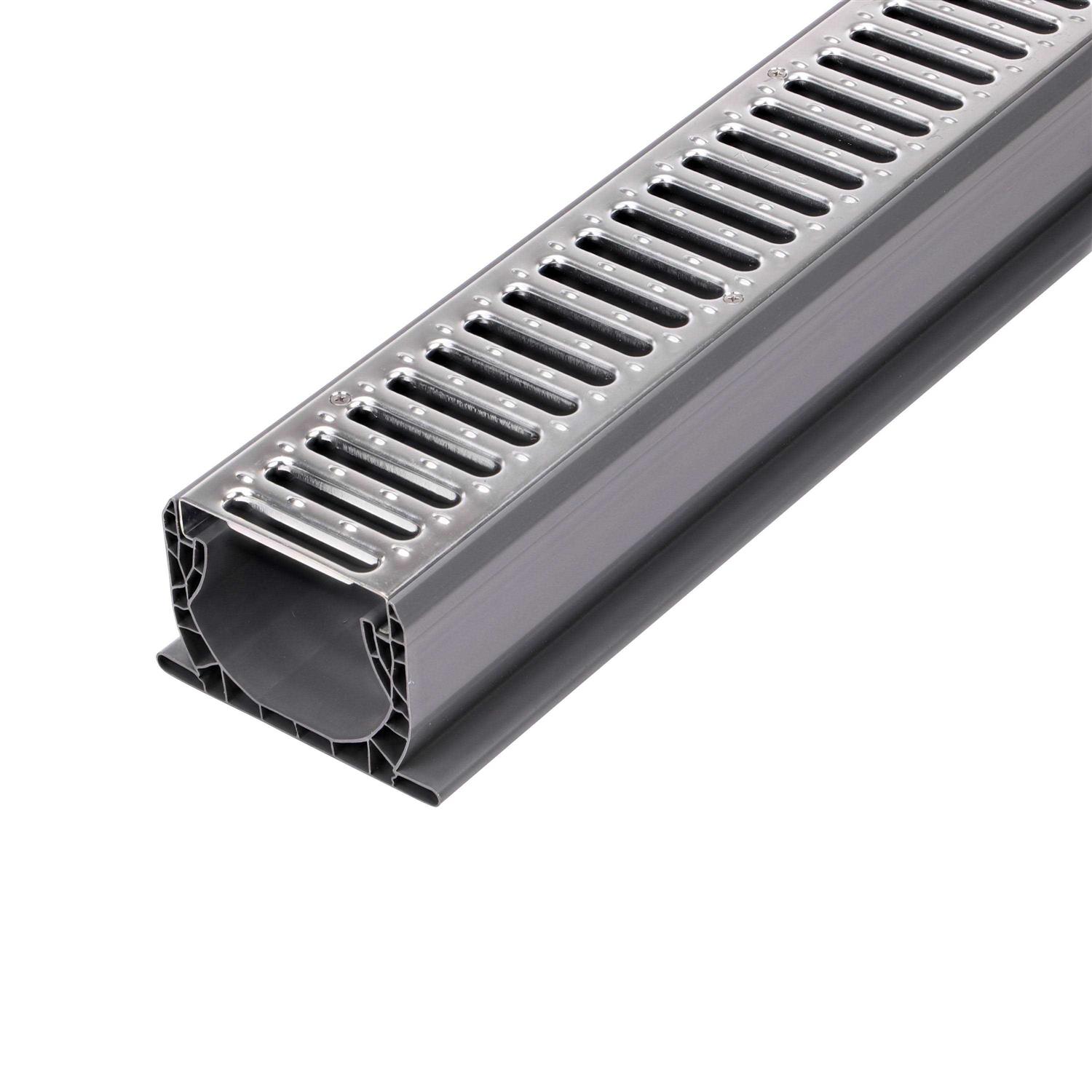 When rainfall or runoff leave standing surface water on your driveway, patio, or courtyard, the water needs a better way to drain. Protect your property from costly water damage with the Spee-D Channel Drain, the #1 bestselling channel drain in the USA. The polyvinyl chloride channel comes preassembled with galvanized steel grates for a faster install. Patented flying buttress design provides load-bearing support, and unique flanges on the bottom provide an anchoring lip for straight installation and prevents floating. The Spee-D Channel Drain is part of the NDS Profile Channel series. Channel drains, also called trench drains, are long, narrow drains that collect water from surrounding surfaces and direct it away to drain pipe. The water is carried to a discharge point downstream such as a pop-up emitter, or to percolate into the ground with a dry well or infiltration trench. NDS channel and trench drains are designed for durability, drainage, and performance, and are a proven alternative to traditional concrete drains. Founded in 1972, NDS is the leader in stormwater management solutions, the preferred choice of professionals, and the largest supplier of channel drains in North America. Our commitment is to provide proven products, tools, and expert support to help you get the job done right. Color: Stainless.