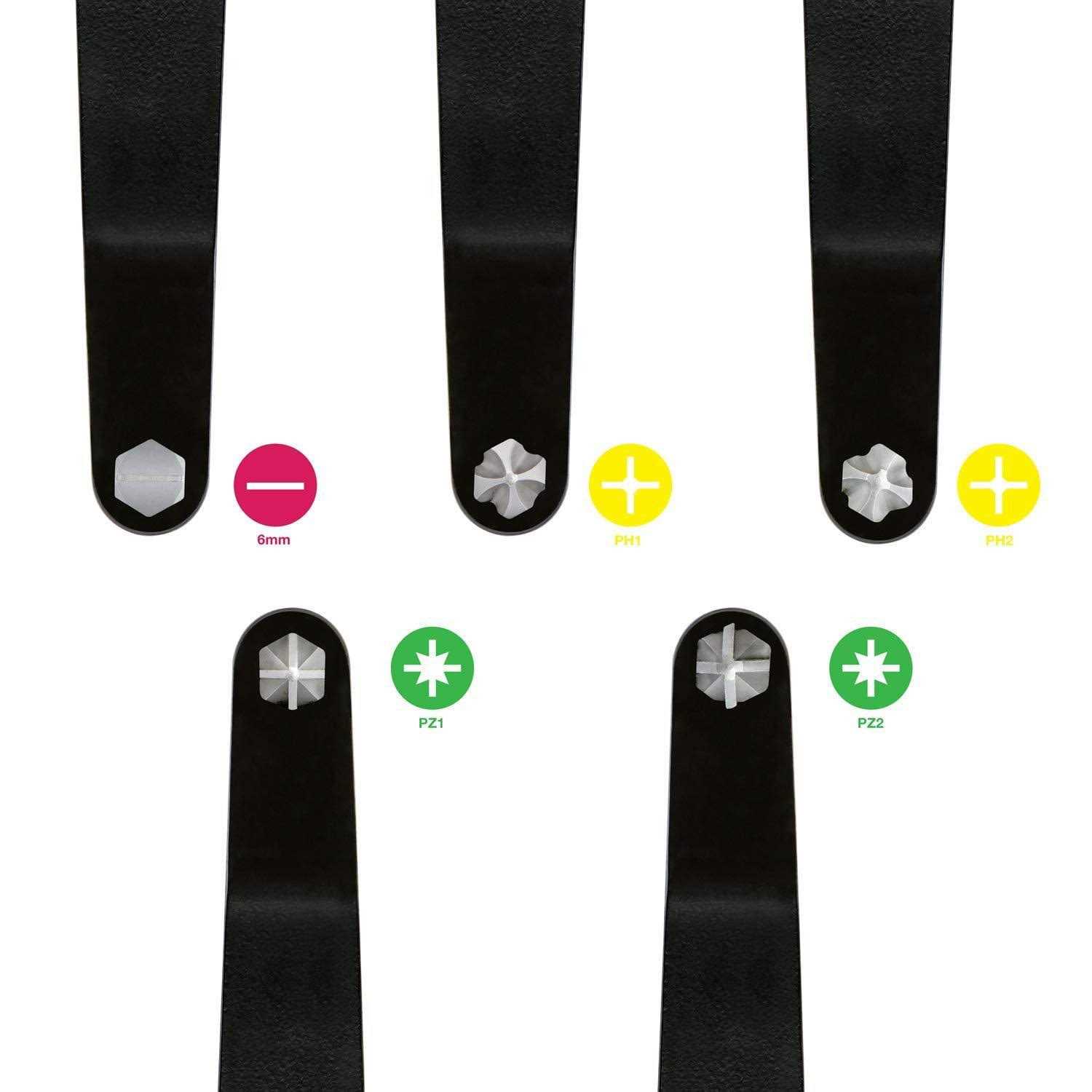 - Set comes with five screwdriver types: PH #1, PH #2, PZ #1, PZ #2, slot 6mm Flathead