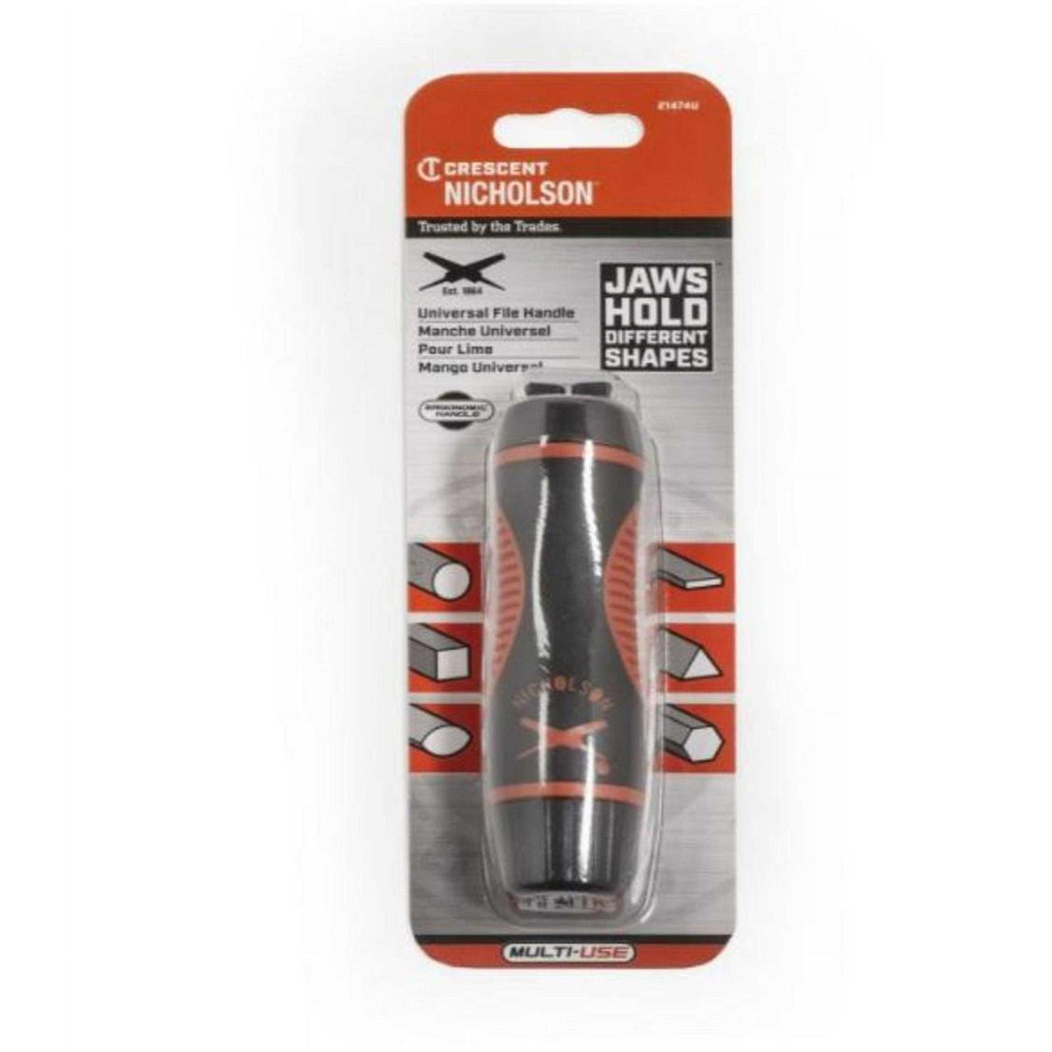The Crescent Nicholson 5″ Universal File and Saw Handle requires no inserts and allows you to work with a full line of instruments, including files, reamers, hacksaw blades, and other tools. Its adjustable, steel jaws clamp to the entire length of the tang for a powerful hold in tough working environments. The large, quick adjusting knob offers fast tool changes, so you can swap files with ease. The ergonomic handle with co-molded grip provides comfort and control and the handle is longer and wider than traditional handles for a relaxed hold.