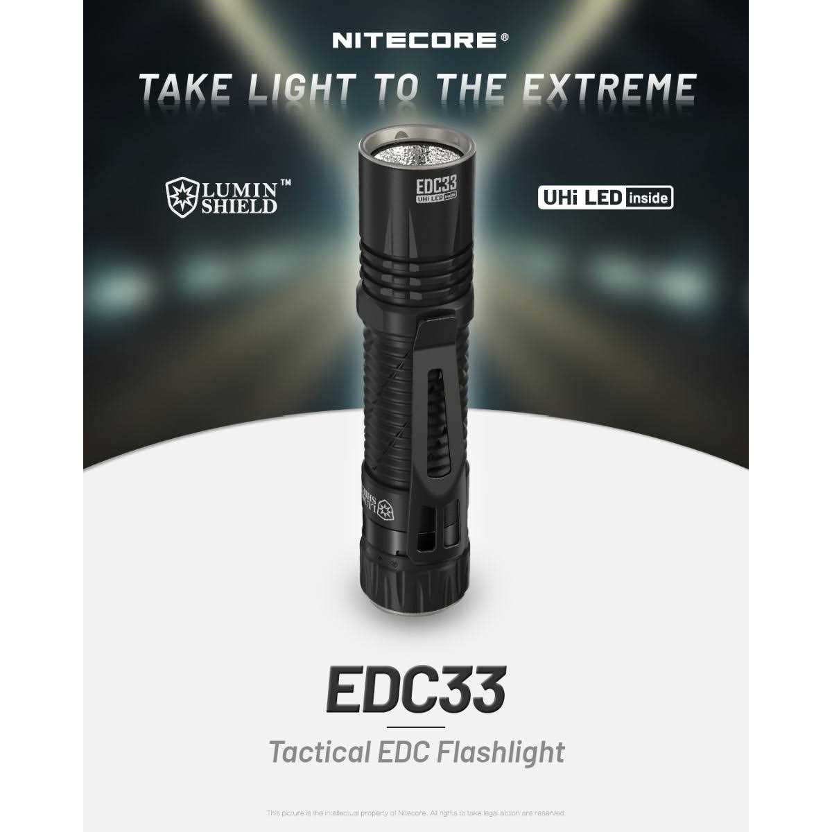 The Nitecore EDC33 EDC flashlight boasts an amazing brightness and throw, making it an ideal choice for everyday carry. Featuring the innovative NiteLab UHi 20 MAX LED, the EDC33 delivers a powerful 4000 lumen output and an impressive throw of 492 yards. Fully press the tail switch to power the light on or off. While the light is on, perform a half-press to cycle through four different brightness levels. The selected brightness level is memorized even after turning off the light. For momentary modes, half-press and hold to activate the 1700 lumen spotlight for searching, or fully press and hold to engage the full 4000 lumen output. The EDC33 intelligently decreases brightness when in close proximity to prevent overheating. The EDC33 offers the convenience of USB-C rechargeability. Simply twist the USB-C cover at the tail to access the built-in charging port. A power indicator is included to notify you when it’s done charging. When fully charged, the EDC33 can provide up to 63 hours of continuous use in low mode and can be fully charged in just 2 hours. The EDC33 also features two lockout modes: Half and Full. In Half Lockout Mode, you can still access the Search and Lumin Shield, while the Full Lockout will fully prevent any accidental activation. At a compact size of 4.55 inches and a weight of only 4.48 ounces with the clip attached, the EDC33 easily fits into any pocket. It is also IP68 waterproof, has 2-meter impact resistance, and has tail stand capability, ensuring reliable performance in any environment.