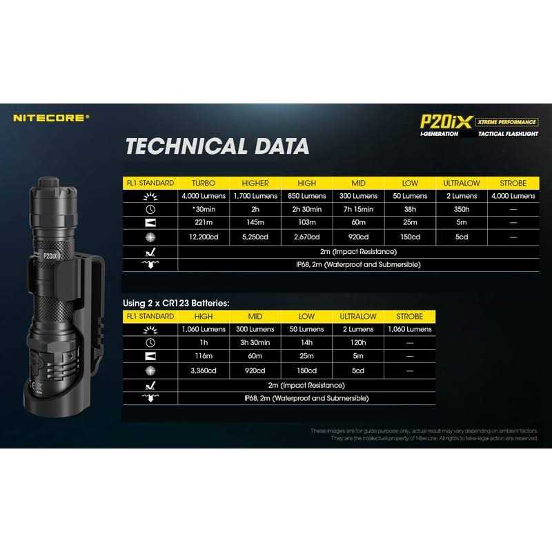 HIGH LUMEN TACTICAL FLASHLIGHT- The Nitecore P20iX bursts out 4000 lumen light that can reach up to 241 yards. Easy to operate with 4 brightness levels, and a strong glass-breaking bezel for emergencies. STROBE READY – Simply press and hold the mode switch on the tailcap to access the strobe mode at any time. Non-linear strobe patterns cause enhanced dizzying effects, highly effective for diffusing a tense situation. USB-C RECHARGEABLE – Fast recharge the P20iX via its USB-C port and enjoy 30 minutes of 4000 lumen turbo and 350 hours runtime on low. READY FOR DUTY – With an IP68 waterproof and anti-impact protection, the P20i is ready for high intensity tactical operations. Included is a NTH20 tactical holster that is compatible with duty belts and MOLLE systems. Content in Package – P20iX, NL2150HPi (installed), NTH20 holster, USB-C charging cable, lanyard, clip, LumenTac organizer The NITECORE P20iX is unrivaled when it comes to performance. Nitecore took the beloved P20i frame and maintained the compact size, ergonomics, and doubled the power with four LEDs. This Xtreme tactical flashlight outputs a 4000 lumen flood light that can reach up to 241 yards. Designed for law enforcement and military users, enjoy instant turbo, instant strobe, six brightness modes and two programmable user modes. Nothing can hold the P20iX back when it can shatter through with its steel bezel with silicone nitrided glass breaking inlays. There is no substitute for the tactical flashlight than the Nitecore P20iX