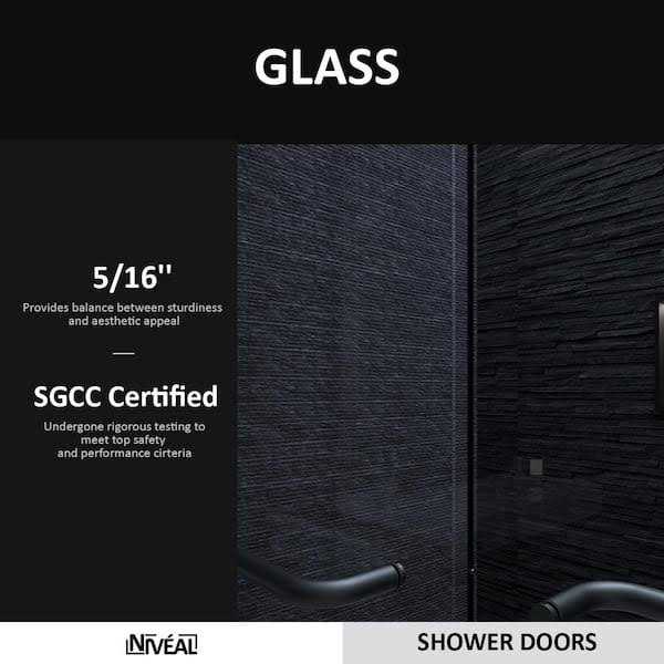 Hoping to add a sense of elegance and modernity to your bathroom. Look no further than Niveal’s Vale collection of semi-frameless alcove shower door. Featuring 5/16 in. (8mm) ANSI and SGCC certified clear tempered glass, easy glide hidden 2-wheel roller system and premium anodized matte black aluminum hardware, Niveal Vale semi-frameless alcove shower door will ensure a long-lasting quality while enhancing the overall beauty of the bathroom. Highly customizable design allows for either right- or left-hand door opening and 56 in. to 60 in. width adjustment. Bring luxury to your bathroom with Niveal.