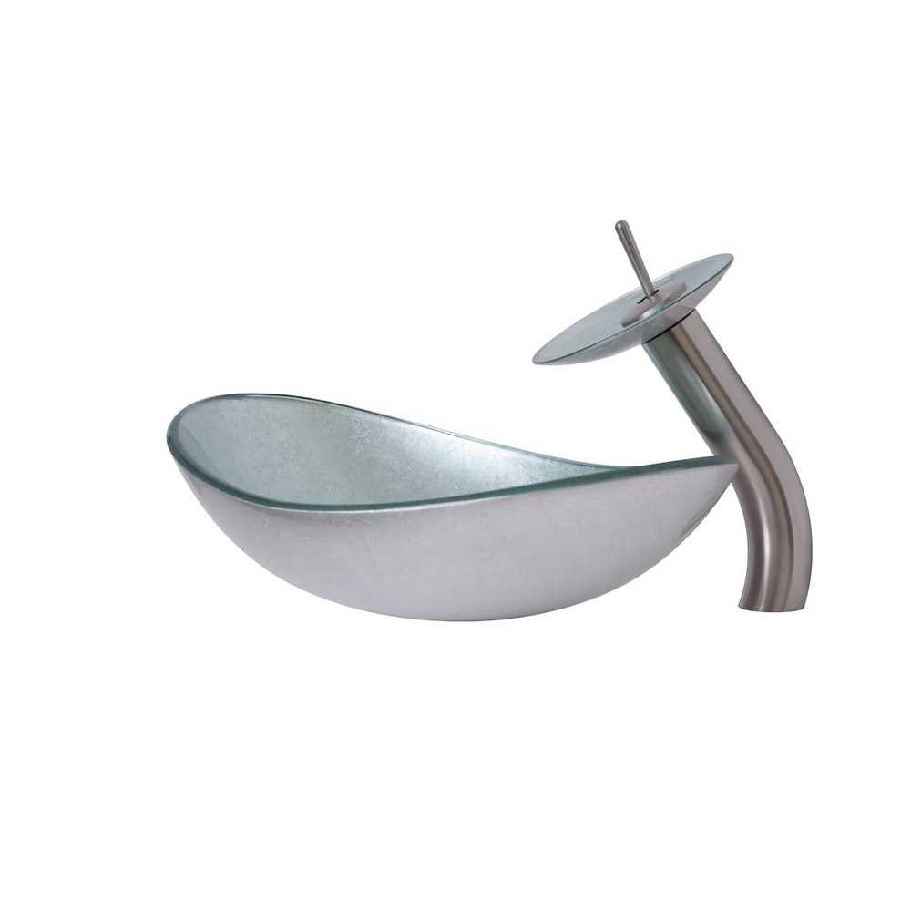 Add a little design and harmony to your bath with Novatto’s silver foiled glass vessel and matching brushed nickel waterfall faucet. The NSFC-70328031001 Argento Oval features a bold silver wrinkled foil design. Novatto uses advanced technology, including computerized glass processing and Italian furnaces, to produce glass basins of unmatched structural integrity. This vessel sink set is a great way to harmonize the decor by unifying the color and textural design of your bathroom. The matching faucet directs a nice waterfall over the glass disc into the vessel sink. When a bath demands superior design and quality, Novatto’s glass vessels add that touch. Each glass sink and faucet features its own beauty of color, structural character and texture, adding a sense of purity, elegance and distinctive look to any design.