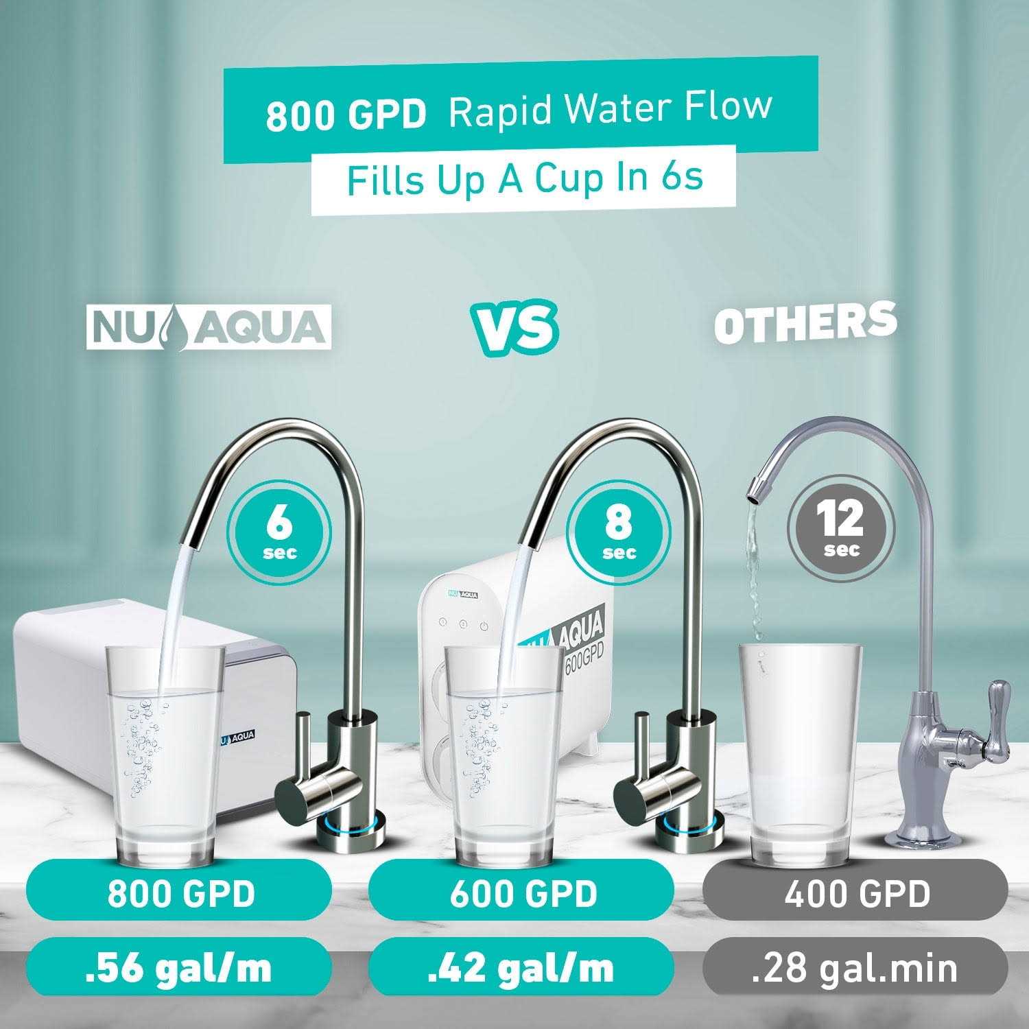 The Nu Aqua 800GPD Tankless Reverse Osmosis System revolutionizes the world of water filtration with its cutting-edge technology and unmatched performance. As a leader in the industry, this reverse osmosis water filter sets new standards for efficiency and convenience, making it the best reverse osmosis system available. With its high-capacity production rate of 800 gallons per day (GPD), this system ensures a steady supply of RO water for your household needs. The advanced reverse osmosis membrane efficiently removes up to 99% of contaminants, including heavy metals, chemicals, bacteria, and viruses, providing you with the purest and safest drinking water. Say goodbye to bottled water and embrace the convenience of having an endless supply of pristine RO water at your fingertips. The system comes with long-lasting filters that require minimal replacement, making it a hassle-free solution for water filtration. Additionally, the smart LED keeps you informed about the filter life, water quality, and system status, ensuring peace of mind and optimal performance. Its compact and tankless design eliminates the need for a storage tank, reducing the risk of bacteria growth and ensuring fresh and clean water every time you turn on the faucet. The tankless design also provides the highest pure-to-waste ratio of 2:1. With this advanced system, you can confidently enjoy the purest and most refreshing RO water, knowing that it undergoes the most rigorous filtration process available.