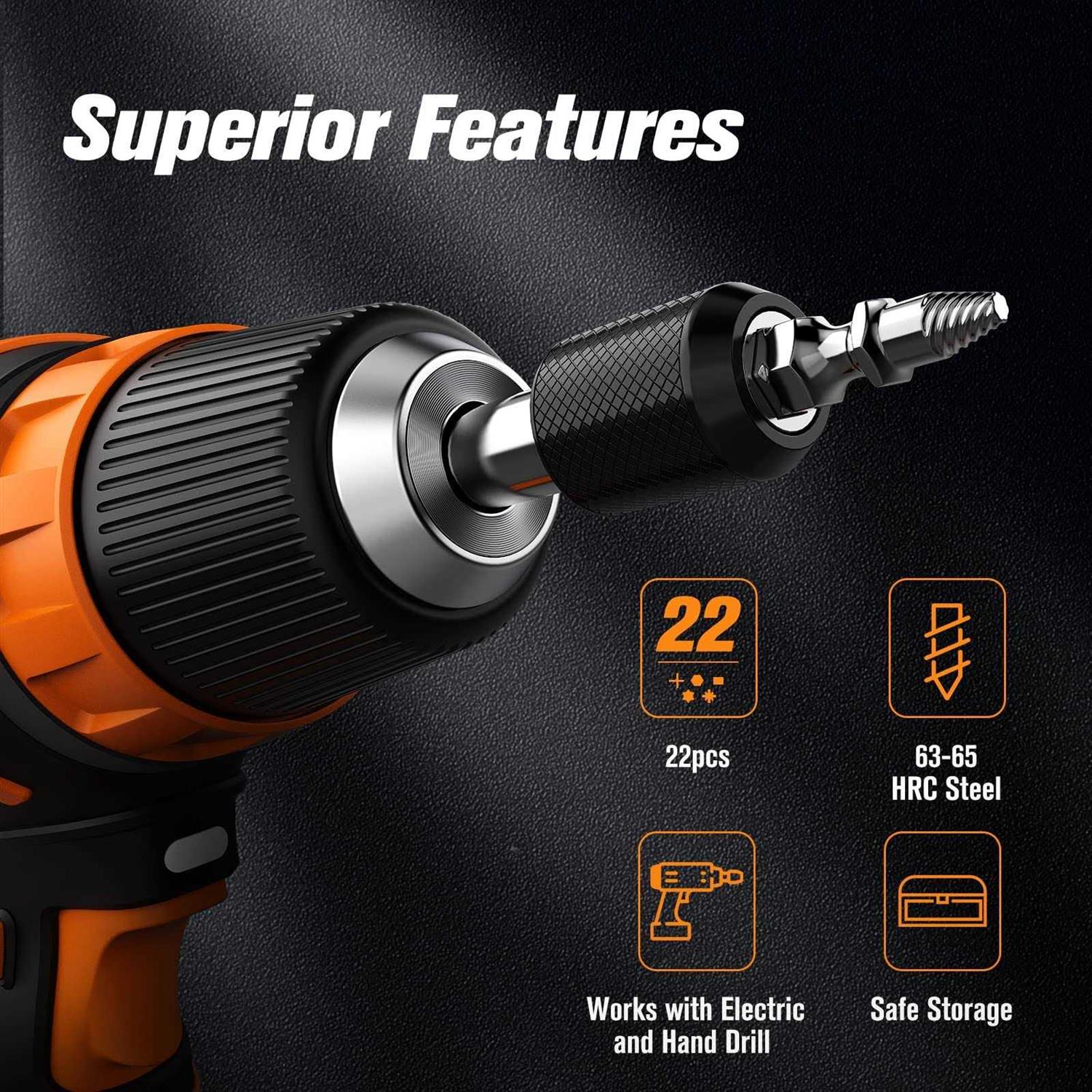 High Quality – The HSS 4341 high hardness alloy steel screwdriver tool has high hardness and durability. If you remove the damaged screw that firmly adheres to the device, the tool will not break easily and the screw can be removed well. Multiple Sizes – The damaged screwdriver set, consisting of 22 pieces, suitable for most screws, e.g. hex screws, pull screws, machine screws, wood screws, self-tapping screws and other screws. It includes #1-10 drill, #1-10 screwdriver, 1 socket adapter and 1 drill holder for magnetic extensions. Easy to Carry – The faulty screwdriver kit comes with a storage tool box. 22 tools can be stored neatly in the toolbox, and you can easily carry them when you need to use them when you go out. Easy to Use Choose a suitable drill or extractor from the #1-5 drill or #1-5 extractor, connect it directly to the drill holder, then use it comfortably. If you use #6-10 drill or extractor, please make sure the drill bit is installed on the sleeve adapter first, then on the elongated drill holder. You can easily remove the screw. Multifunctional Use – The damaged screwdriver set, consisting of 22 pieces, has different sizes to meet your different needs. You can perform many professional tasks, such as decoration, car repair or mechanical maintenance, etc.
