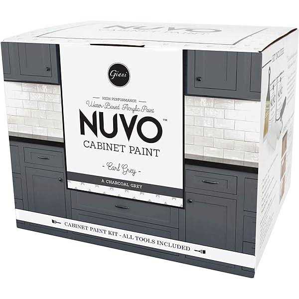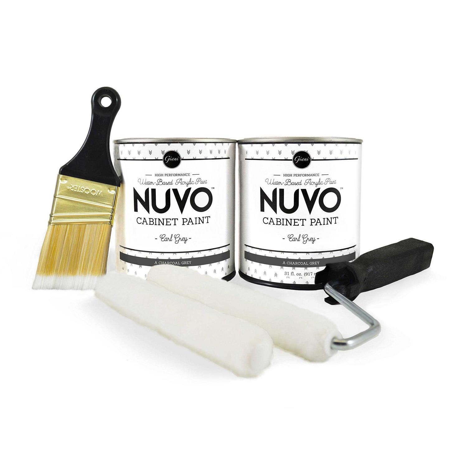 Earl Grey is a cool, charcoal grey much like dried leaves of the famed British Tea, named after 19th Century English Prime Minister, Charles Grey. Part of our Modern Collection, this smoky, silvery color adds sophistication and depth to the extent of classic and modern decor. Dont just live with your outdated cabinets, love them! Nuvo is a DIY makeover process that will transform existing cabinets without the mess, time and cost of replacement. From unsightly and unfashionable to refreshed and renewed, Nuvo will help you paint your cabinets and upgrade your kitchen or bath in a single day. Nuvo is a simple, brush and roll-on application that will transform most wood, laminate and metal cabinets in two easy coats, and dries in a soft, satin finish. Each kit contains all necessary tools and covers 100 square feet, which is the typical amount of surface area of most kitchen cabinets. Nuvo Cabinet Paint is water-based, safe, low-odor and low in VOC. The specialized paint and primer in one system covers most existing finishes with minimal prep, and without the need to dismantle your cabinets. Nuvos durable design is water resistant and withstands the wear and tear of everyday use without additional topcoats or sealers.