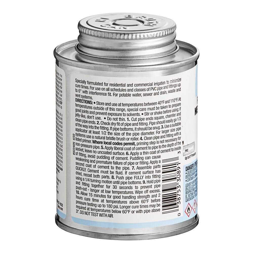 Medium bodied, fast setting, colored cement recommended for PVC pipe and fittings of diameter up to 6 in. Formulated for wet conditions and when quick pressurization and fast installation is needed. For SCH 40 and Schedule 80 potable water pressure pipe, irrigation, gas, conduit and drain waste and vent pipe. Flows freely and covers with a thicker layer than regular PVC cement. Apply at 40 to 110 deg F.