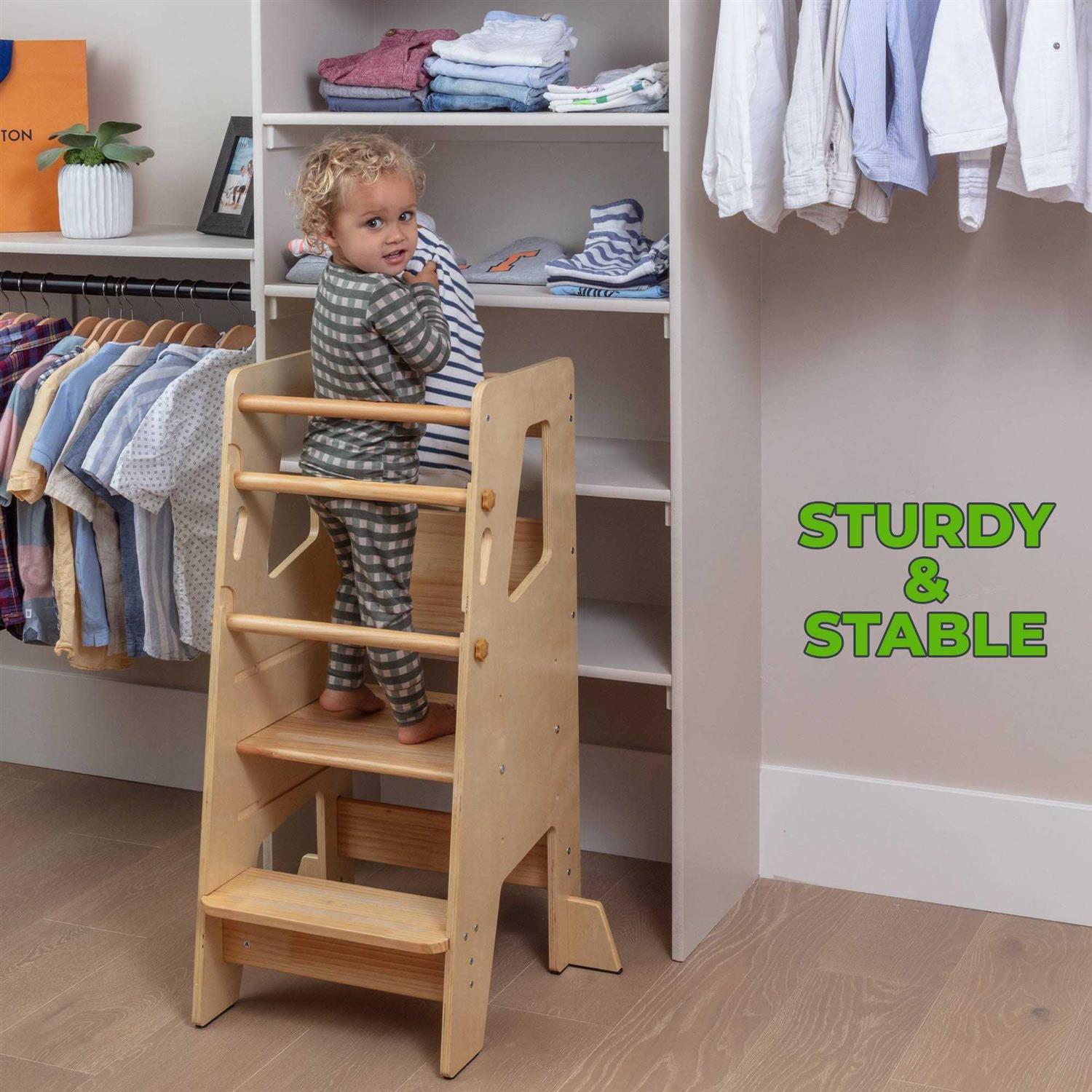 Top 4 Reasons To Choose Our Tower: 1. SAFETY granted by the enclosed structure and 3 safety bars at the back. 2. STYLE – adjustable height and slim design created to fit even smaller spaces 3. NO SLIPPING – little one can safely use the tower while wearing socks 4. NO SCRATCHING – comes with protection for the feet, so your floor will be safe as well