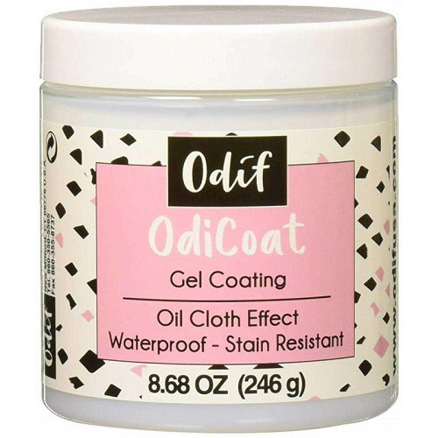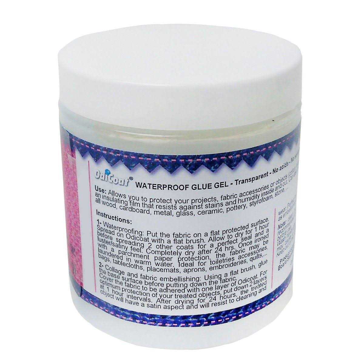This liquid gel provides a waterproof quality and sheen to any fabric or paper. Transparent and odorless, acid-free and solvent-free. Odicoat gives an oilcloth waxed appearance to fabric while protecting it. Once applied the fabric can be sewn, cut, hand or machine washed. Dries in 30 minutes to the touch, and will be completely dry in 12 hours. Can also be sued as a glue. It will adhere fabric to any surface. Contains 8.68oz.