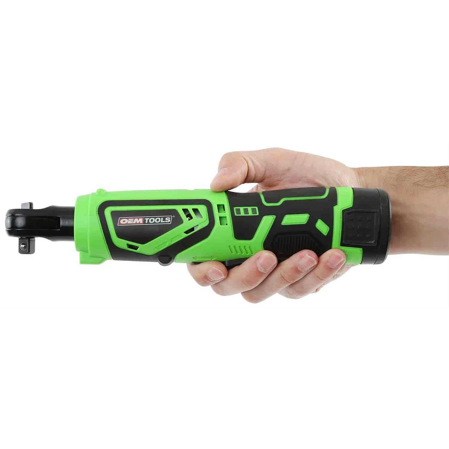 The OEMTOOLS Cordless Power Ratchet is compact, lightweight, and gets the job done. The electroplated cordless wrench ratchet gearhead carries a reverse/forward switch for removing and installing bolts. The battery wrench’s LED light turns on with the trigger to illuminate your compact workspace. The electric ratchet battery is a 2.0 Ah Li-Ion Battery with AC Charger. The 12v ratchet’s battery charges within 5 to 6 hours and completely charges at 7 hours. Battery indicator lights tell you when your 12 volt ratchet is due for a recharge.
