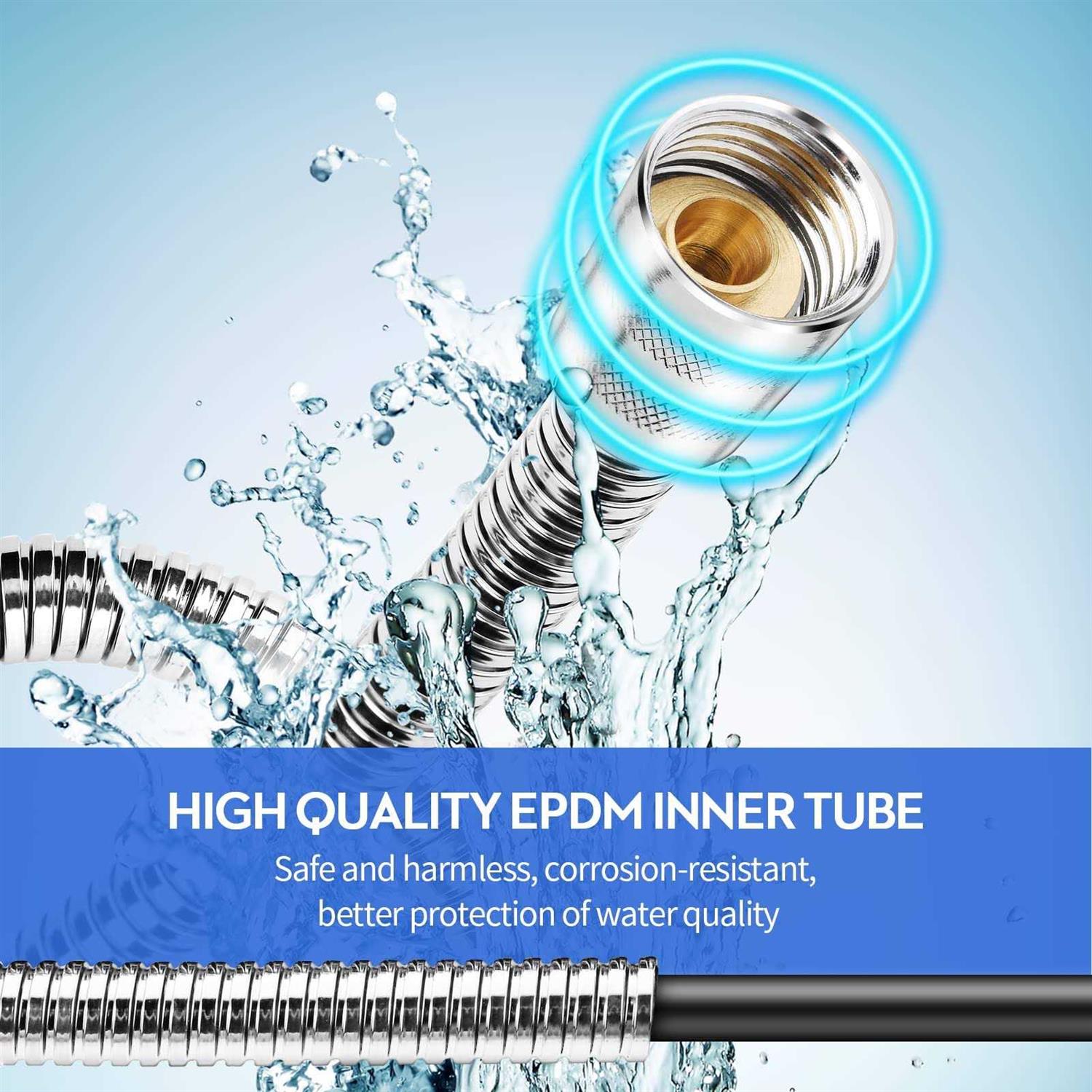 Perfect Functions:Stainless steel 157” shower hose with resist corrosion and tarnishing, and inner pipe made of superior quality PVC material for high pressure and temp resistant. Universal Interface: Comes complete with Built-in washers, not easy to leak.Standard Be applicable fitting G1/2″” size solid brass connectors fit most shower fixture, easy installation. Flexible And Durable:360 degree rotatable , keeping your shower head hose kink-free, you will NO MORE be annoyed by your old twisting shower hose. Super Long Design:Replacement shower head hose Ideal for adult, kids and pets bathing. Offers mobility for assisted or seated showers.Can shower in every room of the house. Product description Size: 157 Inch(4 Meter) Color: Silver More Details: Material: Stainless Steel , ensure non-rustyand durable Inner Tubing Material: Strengthened PVC ,which is non-toxic and odorless Connector Material: Solid Brass Connector Size: 1/2″” Standardsize, fitting for more than 99% family shower water supply and handheld showerheadconnections Length:4 Meters or 157 Inch FEATURES: Strong and durable shower hose with double inter locking construction. The hand held shower hose that enable it to be used withthe majority of shower heads or bath shower mixers available The brass connectors on both ends are superior quality, have passed high pressurewater test and ensure there is no leaking. This long hose is 157 inches in length; fulfill your daily use of showering. Item weight: 0.99 pounds Product Dimensions: 157 x 0.6 x 0.6inches”