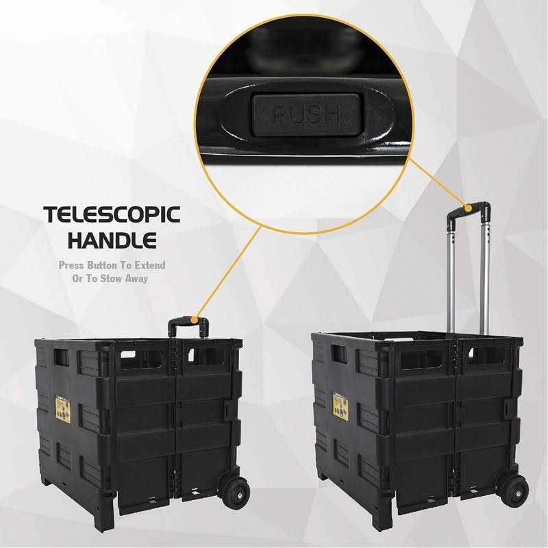 Lightweight, durable, rust proof plastic construction. Telescopic aluminum handle. Convenient and compact; folds down flat for storage. 80 lbs. weight capacity. Folded: 3 in. x 18 in. x 18 in.. Extended: 14.5 in. x 18 in. x 39 in.. inner: 12.5 in. x 15.5 in. x 13.5 in.. Weight: 8.01 lbs. 80LB Weight Capacity Lightweight, Durable, Rush Proof Plastic Construction Telescopic Aluminum Handle Convenient and Compact Folds Down Flat for Storage; Dimension- 3.25 L x 18.5 W x 18.5 H inches. Expend: 14.5″ X 18″ X 39″; Inner: 12.5″ X 15.5″ X 13.5″