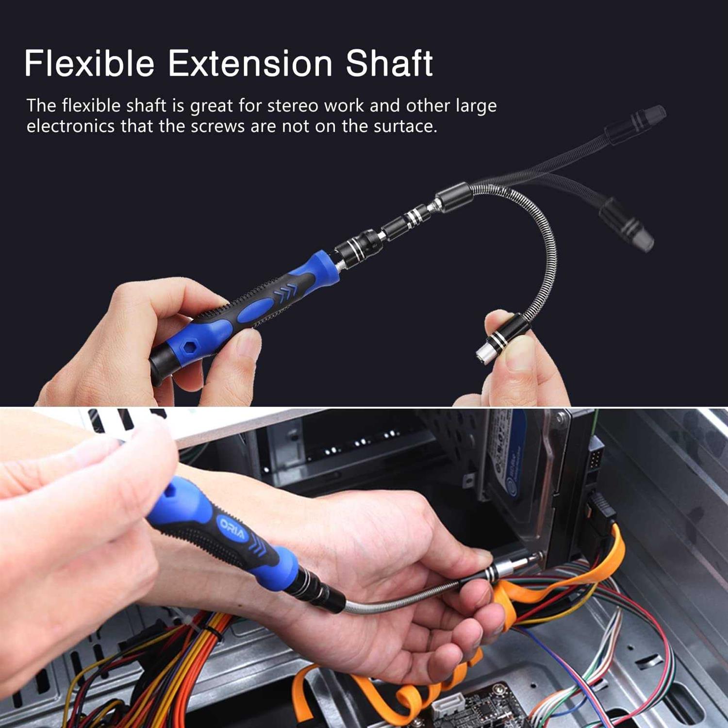 - 56 different kind of bits made of chrome-vanadium steel are carefully selected by Oria to meet all your need. Flexible Shaft.