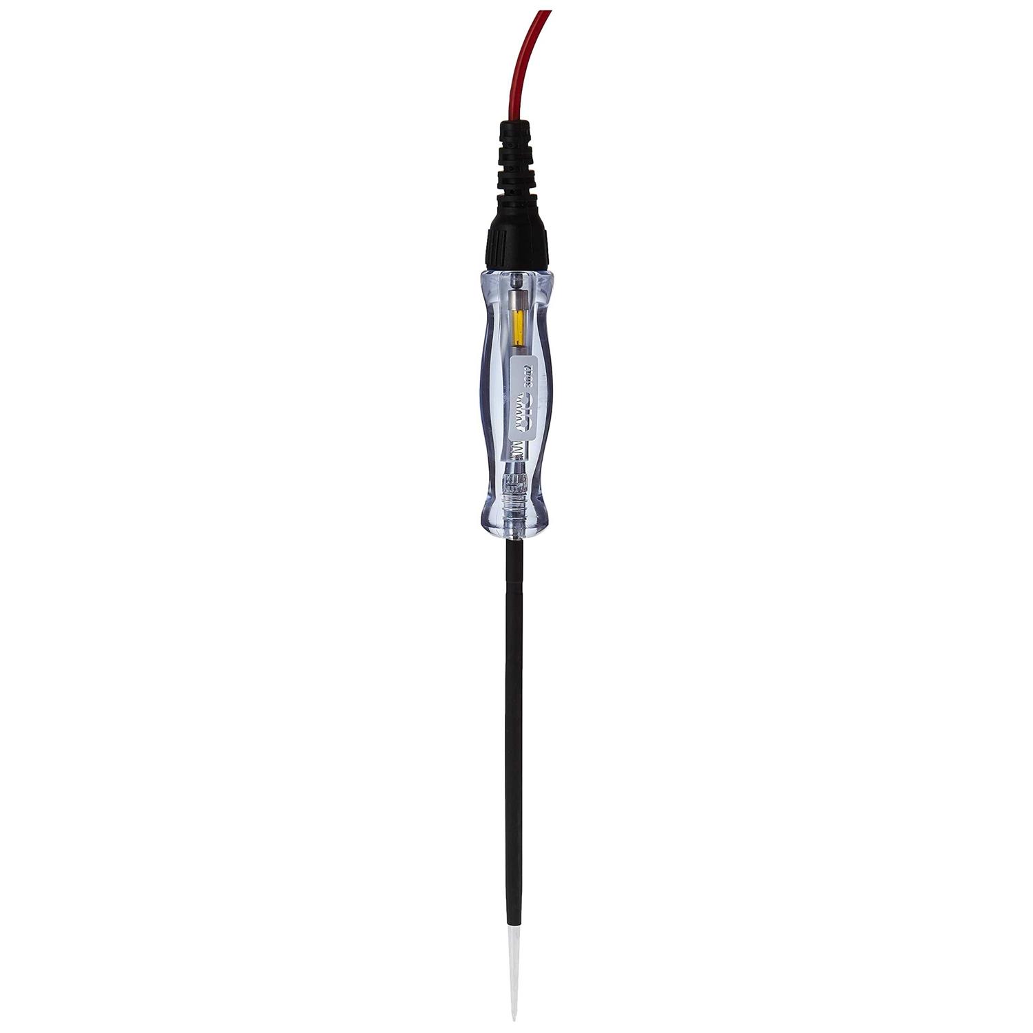 Designed for testing electrical circuits and locating shorts, grounds, and open circuits. Features: 12-foot, heavy-Duty, red coil cord lead. Checks 6- and 12-volt systems. Ergonomic slim designed clear handle. Bright red, slim style replaceable bulb. Positive contact molded strain relief. Heavy-Duty, stainless steel probe with insulated shaft. Heavy-Duty clip with positive soldered connection.