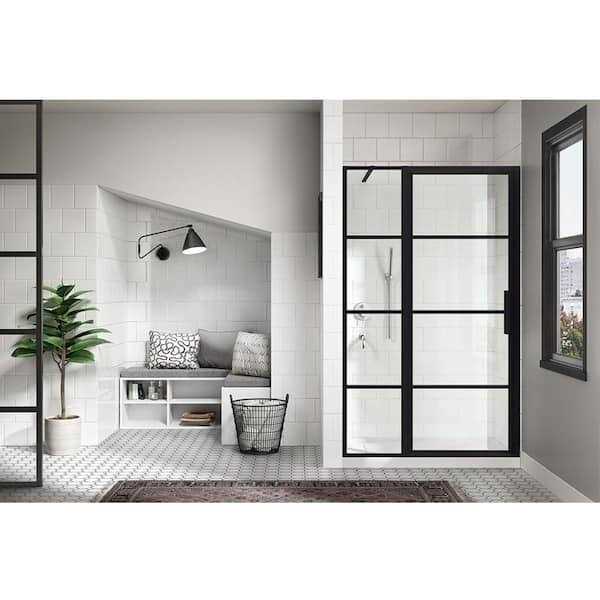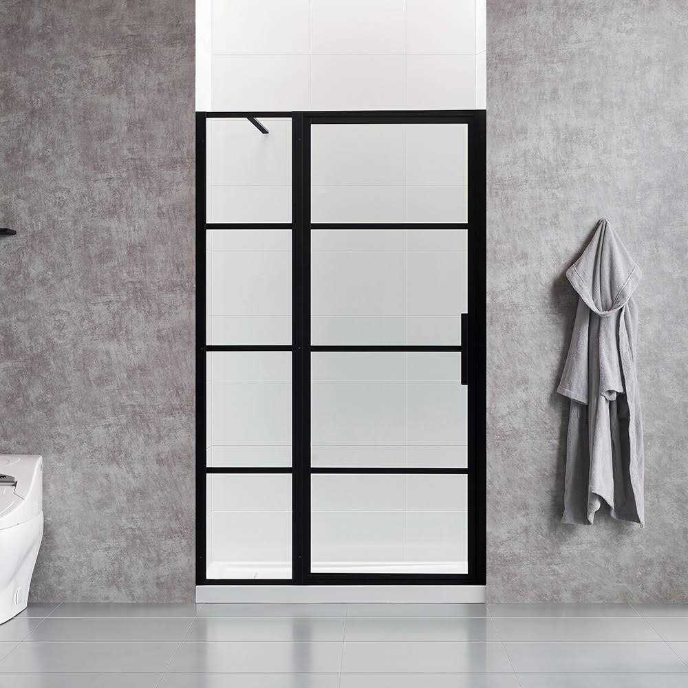 Give your bathroom an industrial, high-end edge with the OVE Milano shower collection. A 48 in. pivoting glass shower door in an Art Deco Crittall inspired black framed window pane grid gives immediate architectural presence to your alcove shower. Discreet hinges and a slim handle compliment its sleek contemporary Euro lines. Features black framed window pane grid, discreet black hinges and slim handle Reversible design for left or right hand door opening Adjustable wall jambs for out-of-plumb walls Includes black support bar and hardware Add OVE shower base with side hidden drain Milano series includes 48 in. and 60 in. corner and alcove showers Achieve a luxurious and astonishing appearance to your bathrooms when using this OVE Decors Milano Framed Fixed Shower Door in Black with Handle.