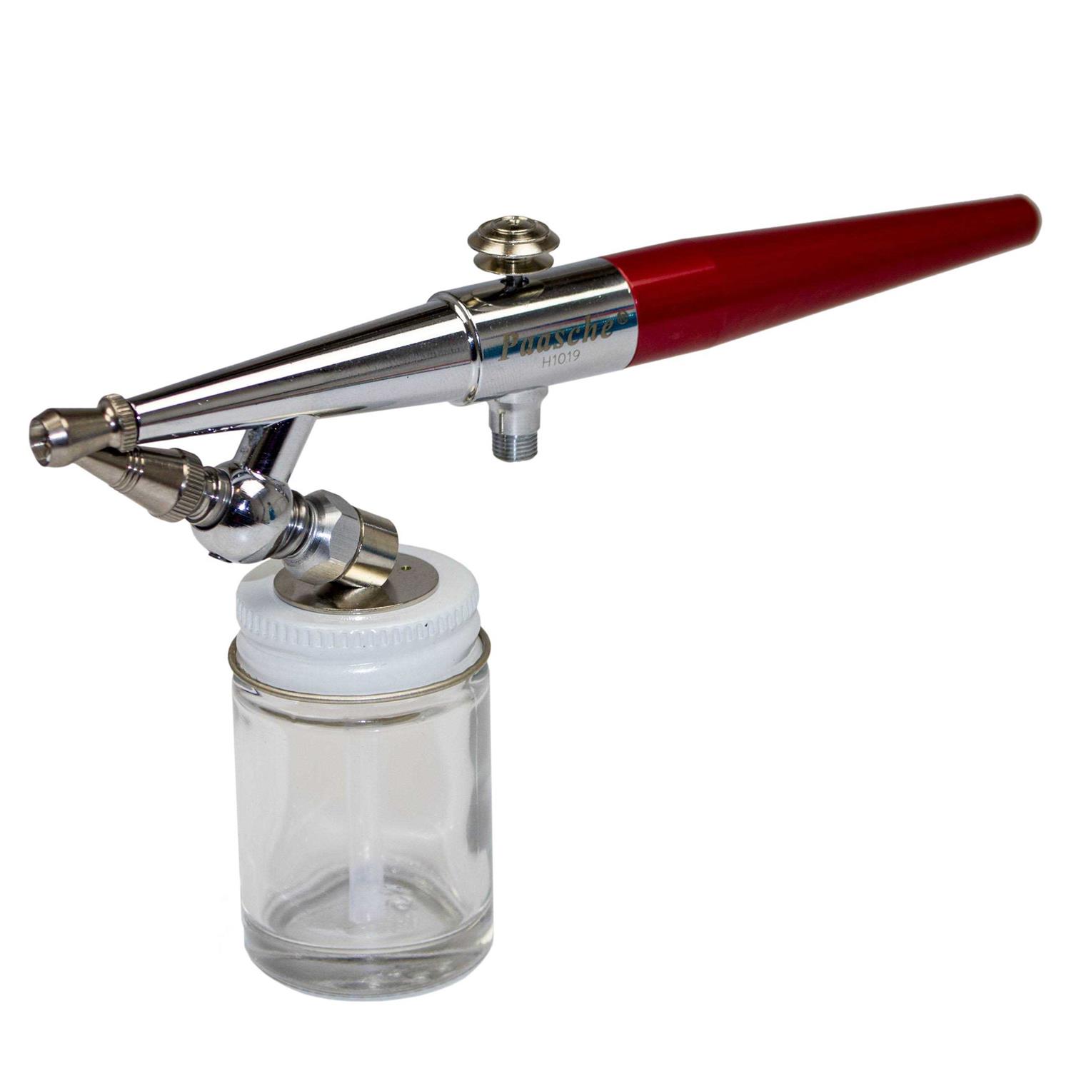 HS-3MH Single Action – External Mix – Siphon Feed Airbrush:The HS airbrush features a unique threaded bottle fitting for the most secure paint bottle connection. The airbrush features a chrome plated body for durability. Included with the airbrush are all three available spray heads, which allow the H airbrush to be used in a wide range of application. The H single action allows the user to achieve fine lines down to 1/16 inch and wider patterns of up to 1-1/2 inches. It simple and easy to use and requires very little practice compared to double action models. The best uses are those requiring more basic spraying like solid coats, uniform lines or stencil work. Clean up is as simple as spraying your paint cleaner though the airbrush. The H is used for many applications including hobby, craft, chip and ding repair, taxidermy, ceramics, cake decorating, tanning, tattoos, etc. The H airbrush is made in the USA.
