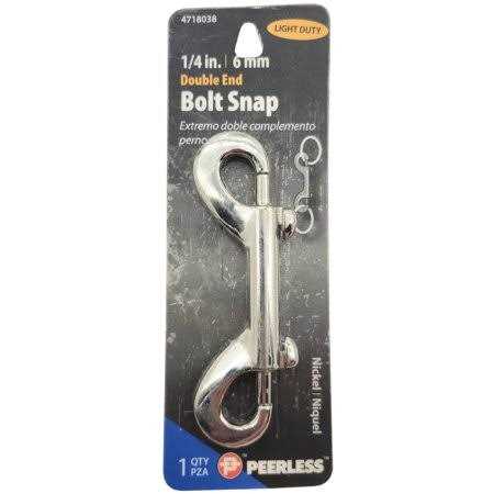 Finish off your projects with durable elements like this Peerless Double End Bolt Snap. This item is suited for all-weather applications and can be attached to wires, ropes, cables, cords, straps and even to a chain. Possible uses for this end bolt zinc snap include securing cables, hanging items, pet tie outs, keychains, gates and more. This particular model is suited for light duty fastening. It is zinc plated and measures 1/4 inch or 6 mm. One package contains one unit. DO NOT use this accessory for load carrying, overhead lifting, or in any application where safety is a factor.
