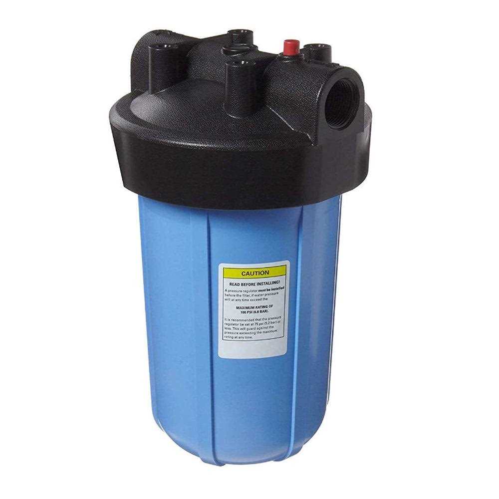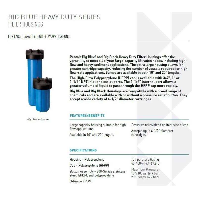 Durable construction. If installed before appliances, the number 10 Big Blue housings extend the life of washing machines, water heaters, and other household appliances by reducing sediment before it reaches the appliances when a sediment filter is used. Ideal for homes, farms, private wells, restaurants, swimming pools, spas, and trickle irrigation. Four times the capacity (lifespan) of standard 10-inch whole house water filters. The number 10 Big Blue housing’s pressure release button on the cap allows for release of the whole house water filter pressure in order to more easily unscrew the sump from the cap. Leaking and clogging is prevented by the dynamically sealing, self-cleaning o-ring. Two number 10 Big Blue housings can be connected with a pipe nipple or pipe union. The union will allow for adjustment of the fitting in the event of leakage. Use the NP-10 pipe nipple to connect two number 10 Housings with 1-inch inlet/outlets.