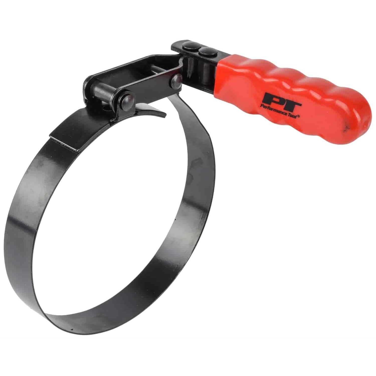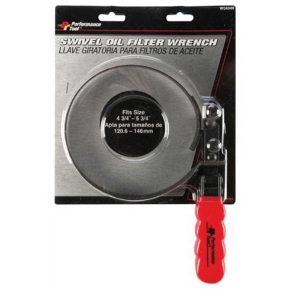 Oil Filter Wrenches by Performance Tool. Details:The Performance Tool W54049 Swivel Filter Wrench provides convenient access to filters in tight and confined spaces with its swivel handle design. Its ergonomic vinyl grip handle ensures a comfortable and secure grip, even in wet or oily conditions. The studded band on this filter wrench provides an enhanced grip, making it easier to remove most spin-on type filters. This filter wrench is designed to fit most spin-on type filters with sizes ranging from 4-3/4 to 5-3/4 inches, making it a versatile tool for any mechanic or DIYer. Constructed with high-quality materials, the Performance Tool W54049 Swivel Filter Wrench is durable and reliable, making it an essential tool for any auto mechanic or DIYer.