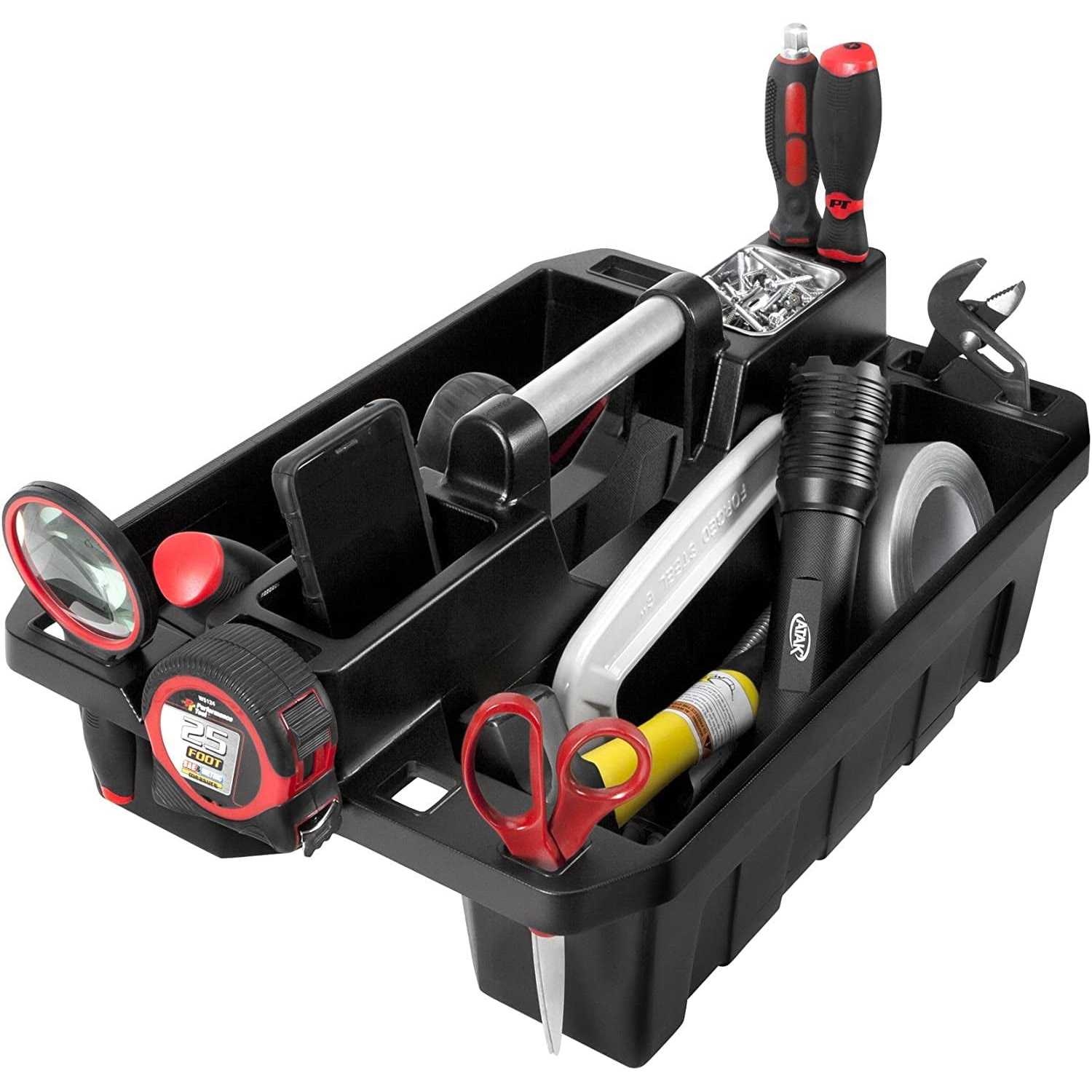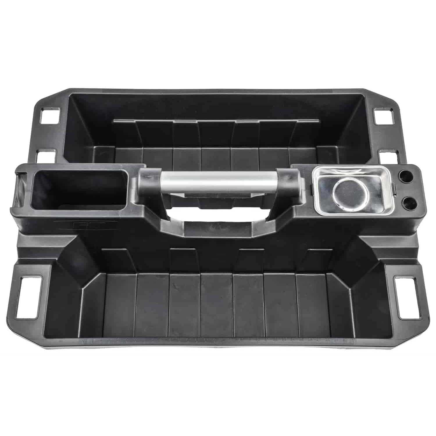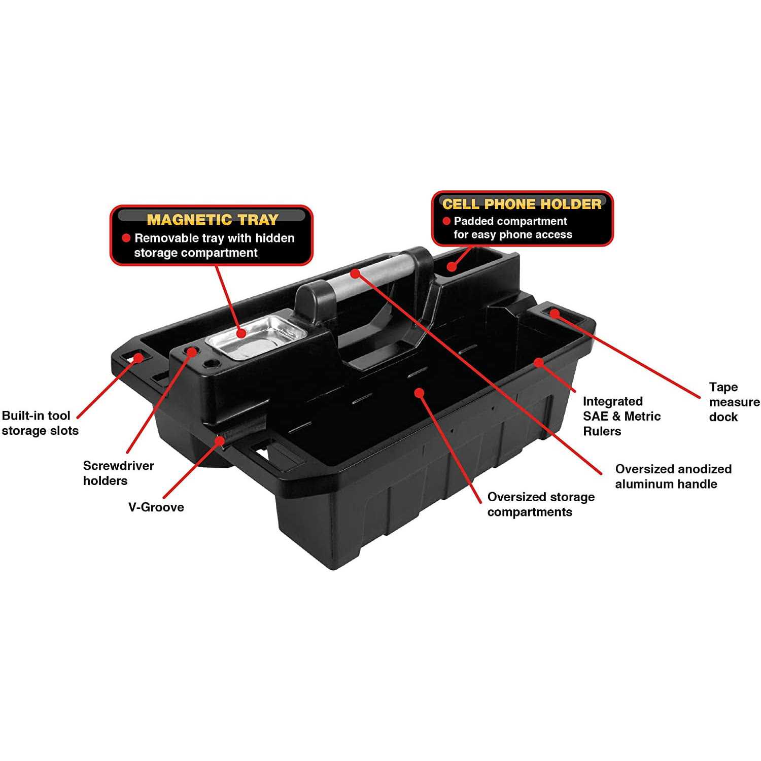 Transport your tools easily and securely with this utility tray from Performance Tool. With an over-sized anodized aluminum handle and tape measure dock, this convenient tool box will help you get all your tools to and from job sites. With built-in stabilizing channel and cell phone holder, this caddy tray is the height of convenience. It also features removable magnetic tray with hidden storage compartment and embossed SEA and metric rulers.