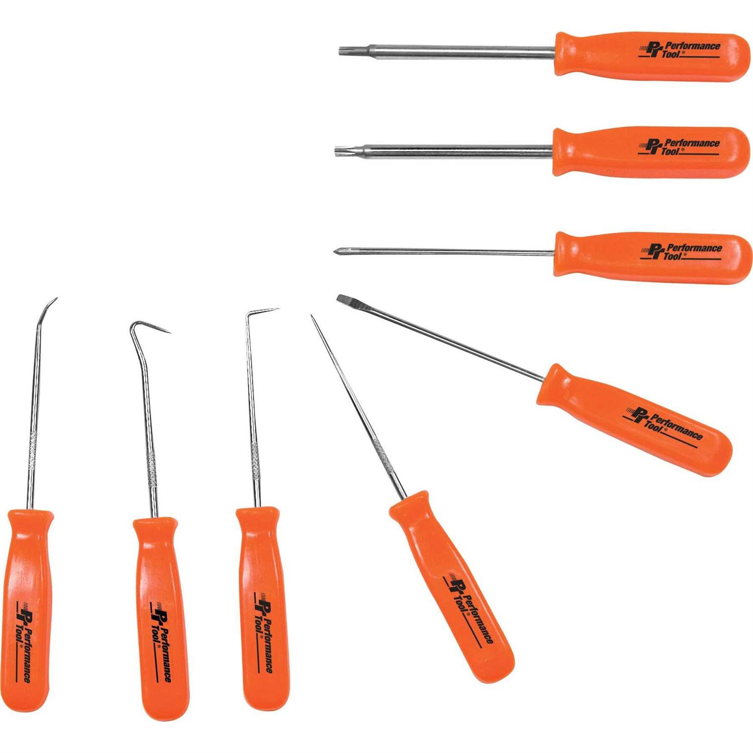Additional Information Chrome vanadium steel shafts with magnetic tips. High visibility PVC handles. Contains curved hook, 90 degree hook, offset 45 degree hook, 1/8″ slotted screwdriver, #0 Phillips screwdriver, straight pick, T15 star driver, T20 star driver.