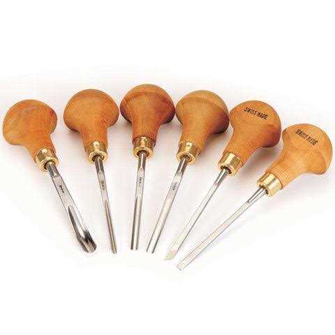 Pfeil carving tools and Pfeil carving tool sets are “Swiss Made. Swiss Made implies reliability and precision. Pfeil carving is undoubtedly the finest carving tool on the market. Pfeil carving tools are second to none in terms of manufacturing quality and durability. Designed for wood block carving, yet furniture makers and decoy carvers like their 4-3/4” length for delicate, intricate work. Hardwood handles fit the palm of your hand so your fingers can guide and control the action of the razor sharp blade. Half round handles make long, low cuts easier and prevent the tools from rolling off your workbench. 6 Piece Palm Set B includes: 3mm No. 5 gouge, 6mm No. 7 gouge, 10mm No. 7 gouge, 5mm No. 9 gouge, 1mm No. 11 veiner, and 1mm No. 12 V-parting tool.