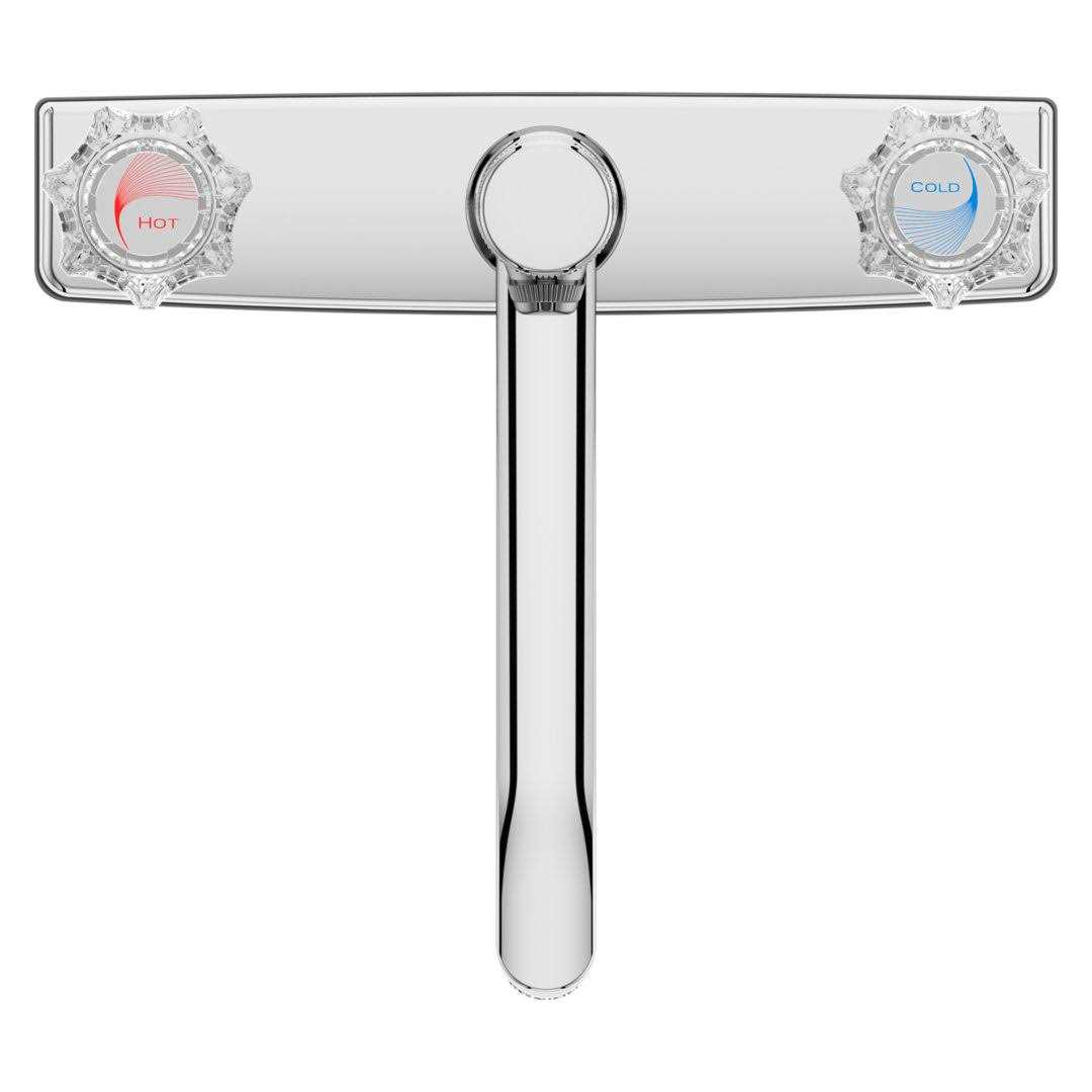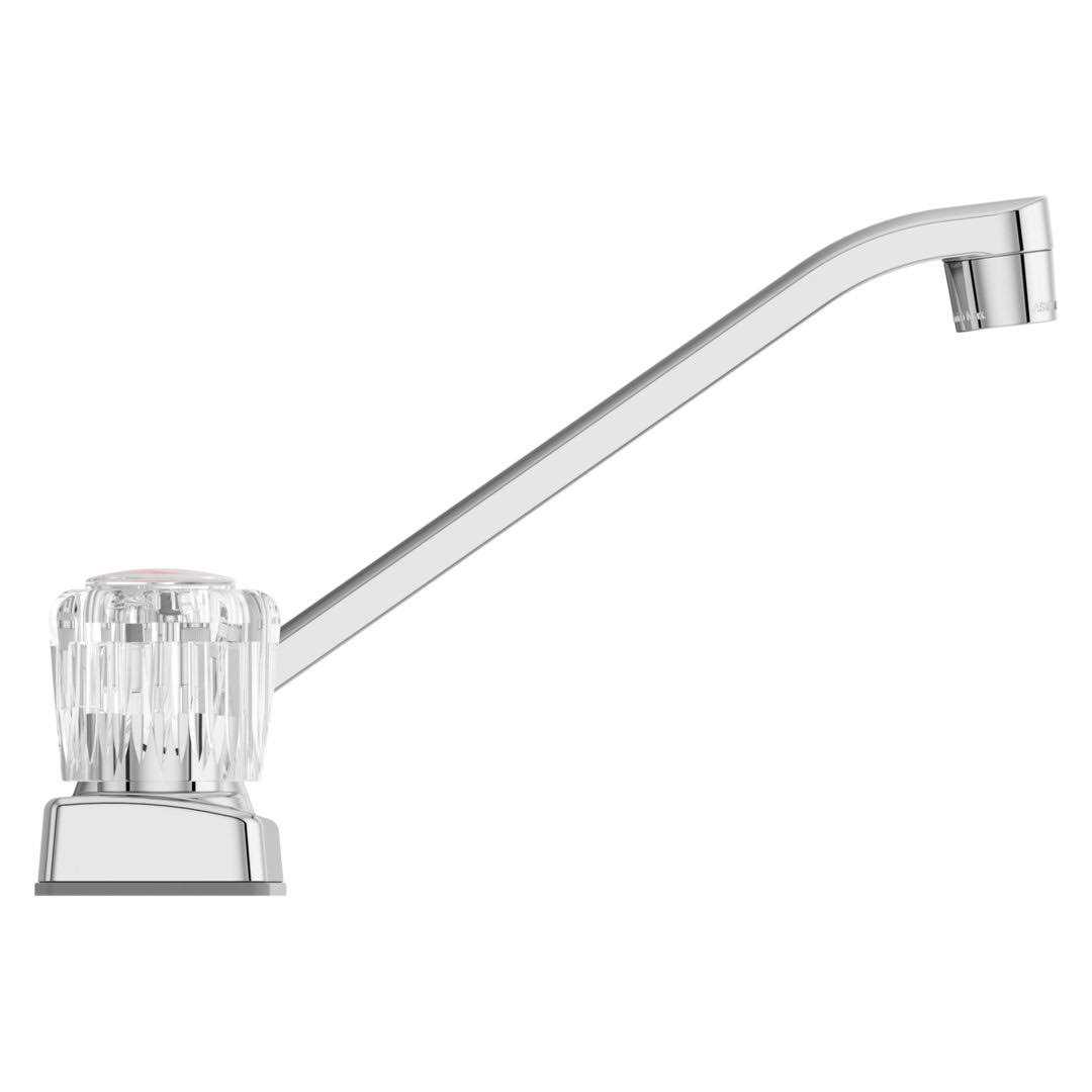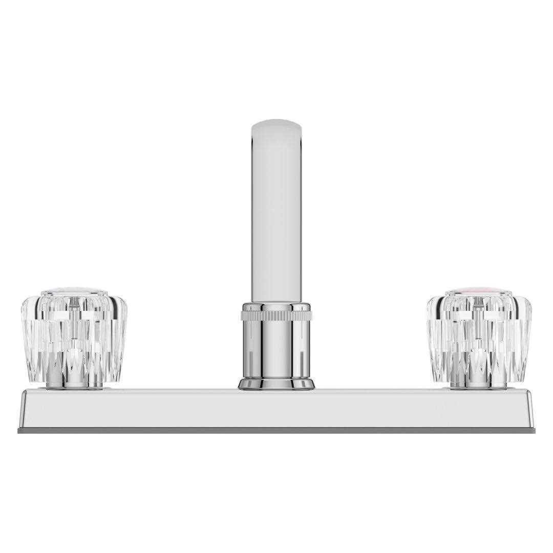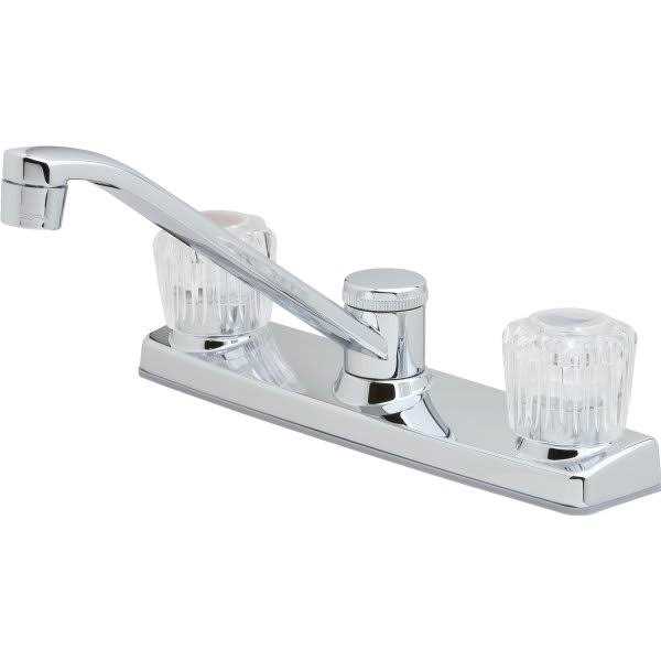 The Pforever Seal feature allows advanced ceramic disc valve technology with a never leak guarantee. Superior design and great value, that’s what Pfirst Series is all about. Spout swivels 360 degrees for maximum maneuverability. Faucet type: Kitchen Number of handles: Double Handle. Faucet finish: Polished chrome. Faucet style: Swivel Handle shape: Standard. Spout reach: 8 inches Spout height: 4.8 inches, Faucet height: 6.19 inches, Maximum deck thickness: 2.5 inches. Model: G135-1100. Assembly required. Material: Brass.