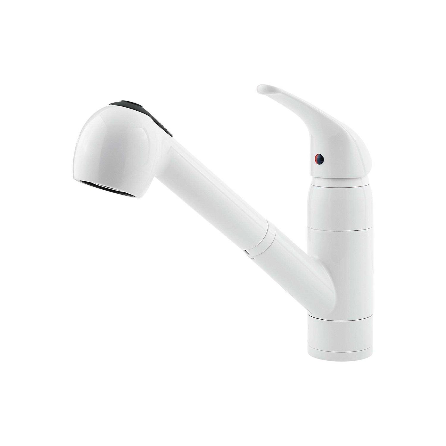 Dimensions: 9L x 2.25W x 8.63H in.. Durable metal construction. Choose from available finish options. For installation with 1 hole. 1 handle for nuanced temperature control. Bold, contemporary design makes the Pfister PFirst F-529-7RYC Pull-Down Kitchen Faucet a sleek addition to your sink. The metal construction resistant to wear and tear, corrosion, and discoloring. A lever handle with a blue and red indicator allows you to adjust the temperature and volume of the water with ease. The spray head of the faucet pulls out, allowing you to reach everywhere you need around the sink. Color: White – G133-10WW.