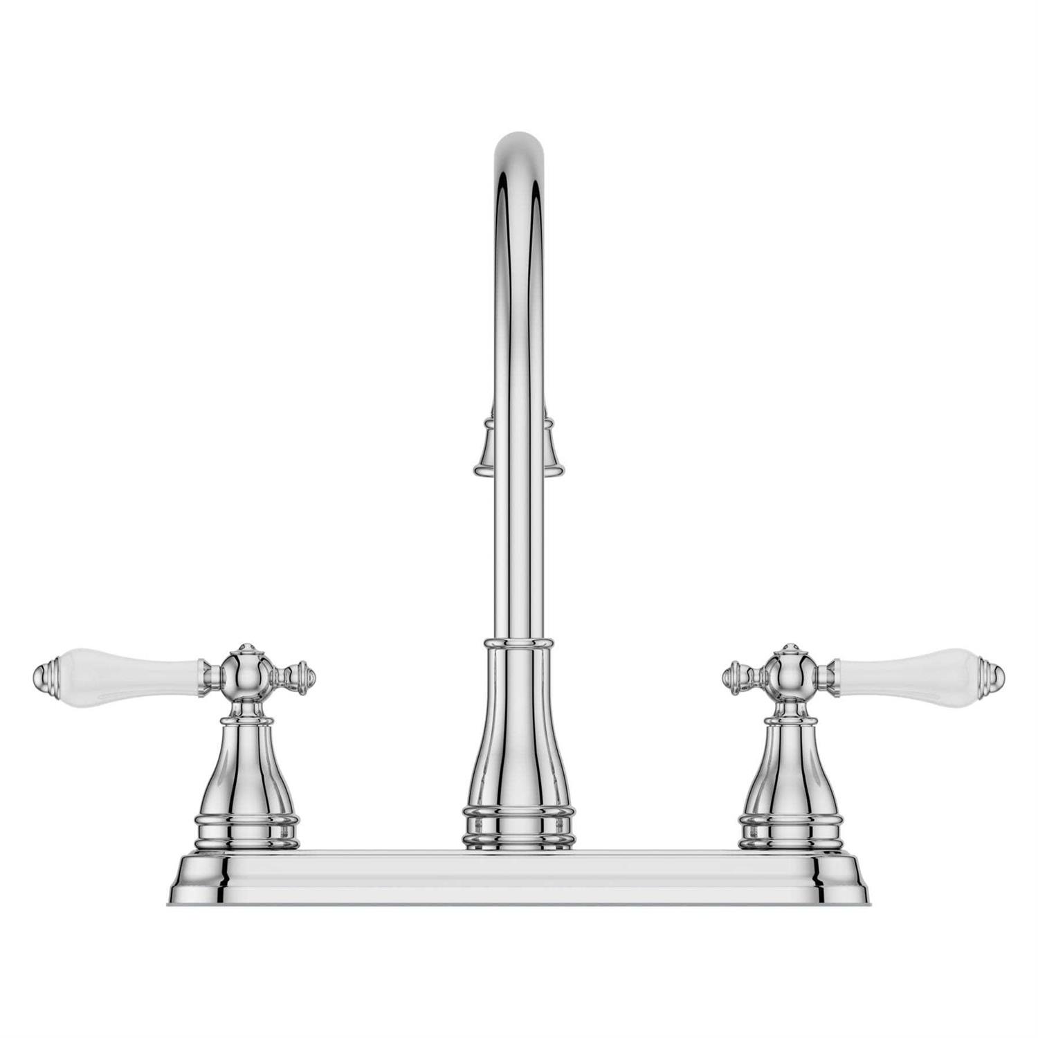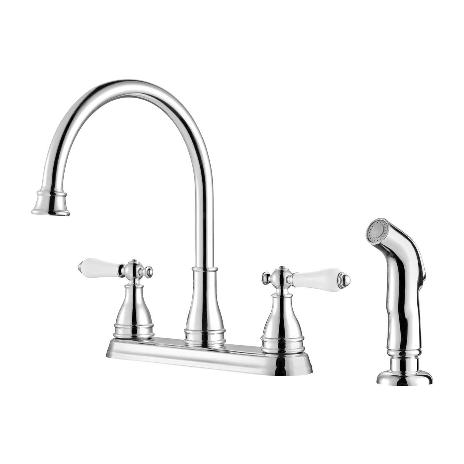 Polished chrome finish kitchen faucet from the Sonterra collection 4-hole installation only 2 porcelain lever handles are easy to use Side spray included for convenient tasks at the sink High-arc faucet spout swivels 360° and makes it simple to rinse large pots and pans in the sink Pforever Warranty covers finish and function for life Fixed hub allows for smooth handle rotation ADA-compliant faucet is easier, safer and more comfortable for those with disabilities or limited mobility to use Polished chrome finish kitchen faucet from the Sonterra collection 3 – 4-hole installation 2 porcelain lever handles are easy to use Side spray included for convenient tasks at the sink High-arc faucet spout swivels 360° and makes it simple to rinse large pots and pans in the sink Sink or countertop-mounted faucet offers a seamless look and is easy to install Pforever Warranty covers finish and function for life Fixed hub allows for smooth handle rotation ADA-compliant 1.8 GPM