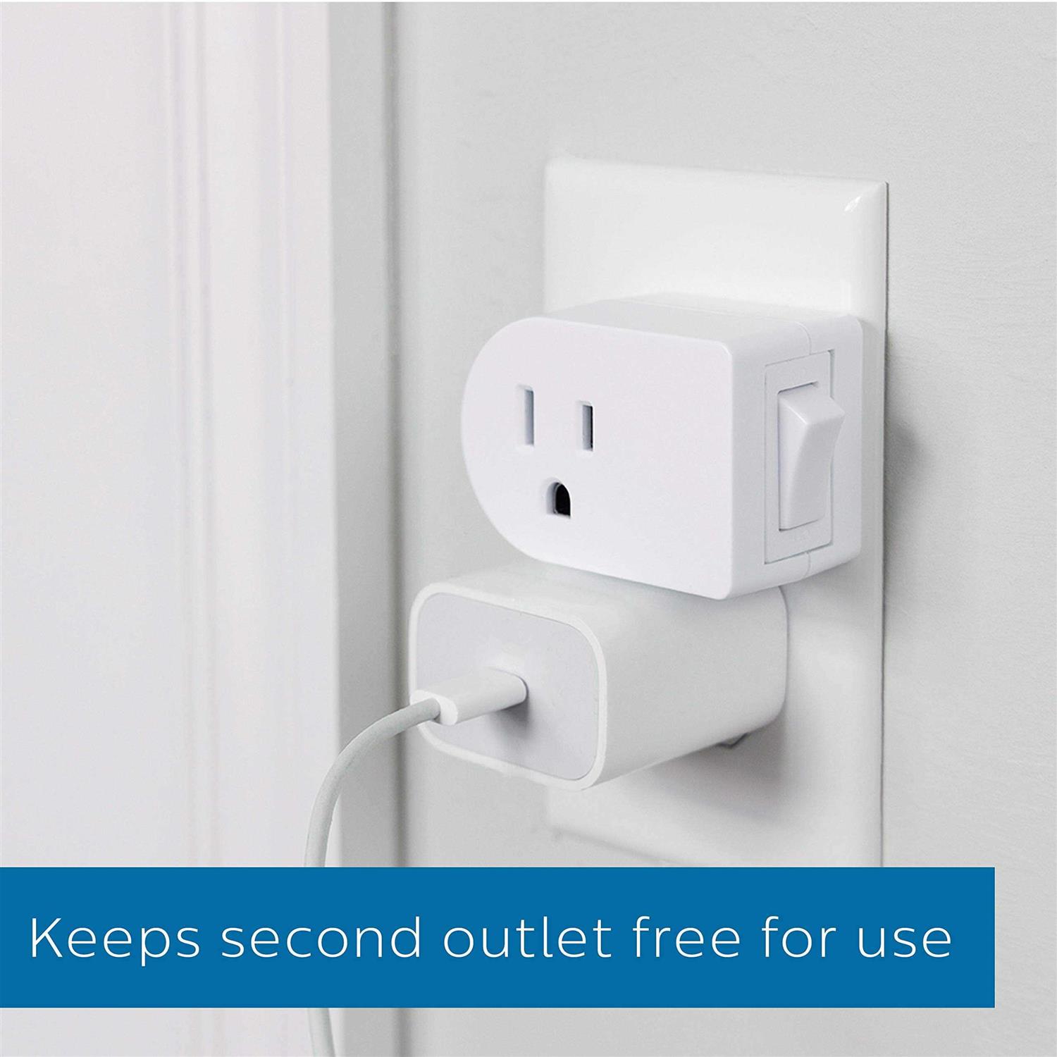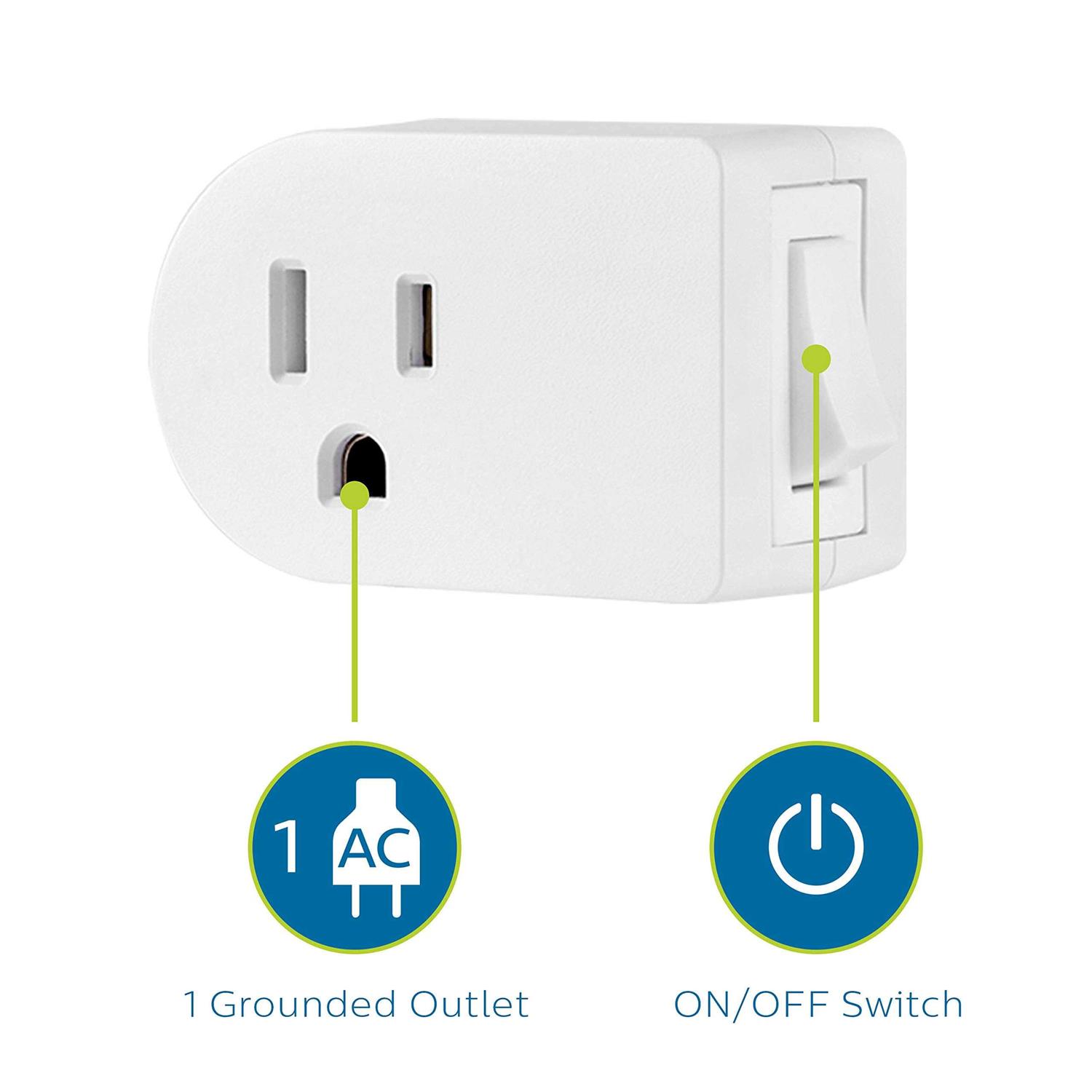 Outlet Switches by Philips Accessories. Details:Power is within your reach with the Philips Grounded Outlet Power Switch. This handy accessory adds a convenient ON/OFF switch to any grounded three-prong outlet. Great for hard-to-reach lamps, appliances, indoor holiday lights and items without ON/OFF switches, this power switch is easy to operate and features a unique design that leaves the second outlet free for use. By allowing you to control the power going to your device, this switch helps you save money and energy by drawing zero power in the off position. The white finish blends into any space, and the easy installation makes this power switch great for everyday use. Simply plug the switch into any grounded outlet and plug your lamp or appliance into the power switch. The Philips Grounded Outlet Power Switch is your convenient power solution.