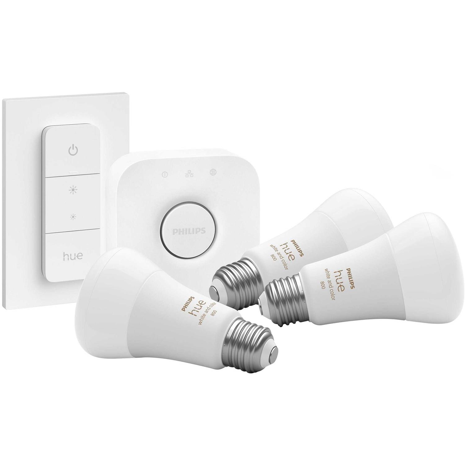 Description Limitless possibilities for extraordinary experiences. The Philips Hue white and color ambiance LED starter kit contains 3 bulbs, a bridge, and dimmer switch. It can transform your lighting into an extraordinary experience with colored and white light. Synchronize lights to your music, TV, and games for immersive effects. Features Choose from 16 million colors and shades of white Turn your everyday smart lighting into an extraordinary experience. Dimming and brightening features at your fingertips The variable lumen output lets you adjust each light’s output without having to adjust the dimmer switch. White light that fits your needs Choose from different shades and intensities so you can comfortably concentrate, read, relax and more. Remote control with your smartphone or tablet Create custom scenes, and unleash your creativity. Compatible with Nest or Samsung Smart – Things systems Pair your kit with ecosystems for home automation. Voice control for your smart home Control your Philips Hue lights with your voice using Alexa, Apple Home – Kit, or the Google Assistant. Use screws or adhesive tape on back plate of your switch Place it anywhere you want. Apple, the Apple logo and i – Tunes are trademarks of Apple Computer, Inc., registered in the U.S. and other countries. i – Pod is a trademark of Apple Computer, Inc.