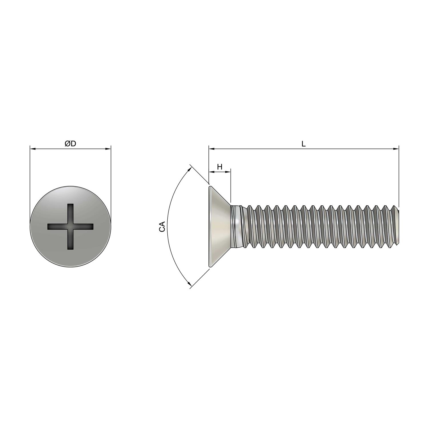 The M6 x 20mm Phillips Countersunk Screws (DIN 965H / EN ISO 7046-2) – Stainless Steel (A2) has the following features:DIN 965H / EN ISO 7046-2 Manufacturing Standard, 20mm Length (L), Stainless Steel (A2) Material, Stainless Steel (A2) Material Specification, 1mm Pitch, PH3 Drive Size, Natural Finish, Metric Metric or Imperial?, M6 (6mm) Thread Size, 3mm Countersunk Length (H), 90 degrees Countersunk Angle (CA), 10.57mm Head Diameter (Min) (D), 11.3mm Head Diameter (Max) (D), +2/-0 degrees Countersunk Angle (CA) tolerance, /p/35-stainless-steels Material Link, /p/438-natural-finish Finish Link. Discover more about the Metric Phillips Countersunk Screws range. Accu’s Metric Phillips Countersunk Screws are fitted with a standard Phillips head. Phillips heads have been widely used throughout the fastener industry since their invention in 1935. Modern engineers may argue that more recent drive types such as Pozi & Torx offer superior torque and less cam out. If you’d like to investigate these modern drive types, please visit our parent countersunk screw category. Materials Phillips Countersunk Screws can be manufactured in a range of materials, including Stainless Steel, Aluminium, Brass, and Phosphor Bronze. Specialist thermoplastics such as PEEK, Polyamide, Polycarbonate and Nylon are also available. Additional finishes, such as Chemical Blackening and Thread Locking Patches, can be applied to Stainless Steel components on request. Metric Accu’s Phillips Countersunk Screws are manufactured in accordance with DIN 7985H, and are available as standard in metric sizes ranging from M1.2 up to M10. Lengths of between 2.00mm and 150.00mm are also available. Imperial Imperial Phillips Countersunk Screws are manufactured to the ANSI Standard B18.6.3. Diameters from #0 up to #6, and lengths of between 1/8 inch and 6 inch are available as standard. Additional sizes can be manufactured on request.