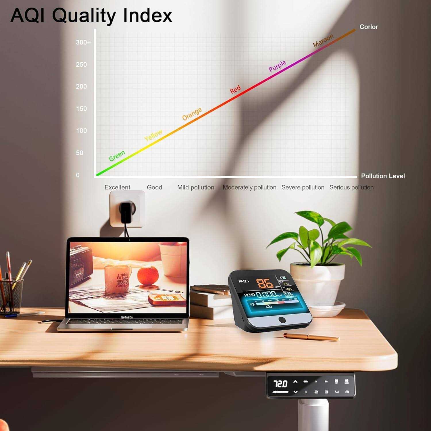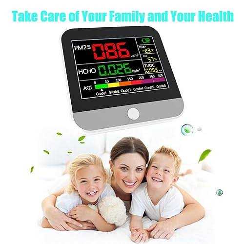 【MULTIFUNCTIONAL AIR QUALITY METER】This 8 in 1 air quality tester can real time accurate detect PM2.5/PM1/PM10, AQI,formaldehyde (HCHO), volatile organic compounds (TVOC), temperature and humidity. It is necessary to know the air quality of the place where you live and it can help you understand indoor air quality at a glance. 【COLOR LED SCREEN】This PM2.5 detector adopts intelligent color screen, which is super easy to read and shows clearly real time data. You can directly to know the overall environment quality and track on each gas mean value to know what gas in air is unsafe and take accordingly actions. In alert mode, the monitor will alert you to the environment by changing the colors. 【USB RECHARGEABLE BATTERY】This indoor air quality monitor adopts 3000mAh battery and supports USB charging, supporting a long time of continuous use and providing great convenience to charge, so that you can check the air quality from anywhere. It can carry on long time uninterrupted monitoring to air quality and will always take care of you and your family health. 【WIDE APPLICATION】This indoor air quality meter is small and portable, can detect the gas quality in bedroom, living room, kitchen, office, car, school, hotel, cellars, restaurant, campground and other environments. It is suitable for home air detection, car air detection, grow room, maternal and child room air detection, and public place detection and so on.