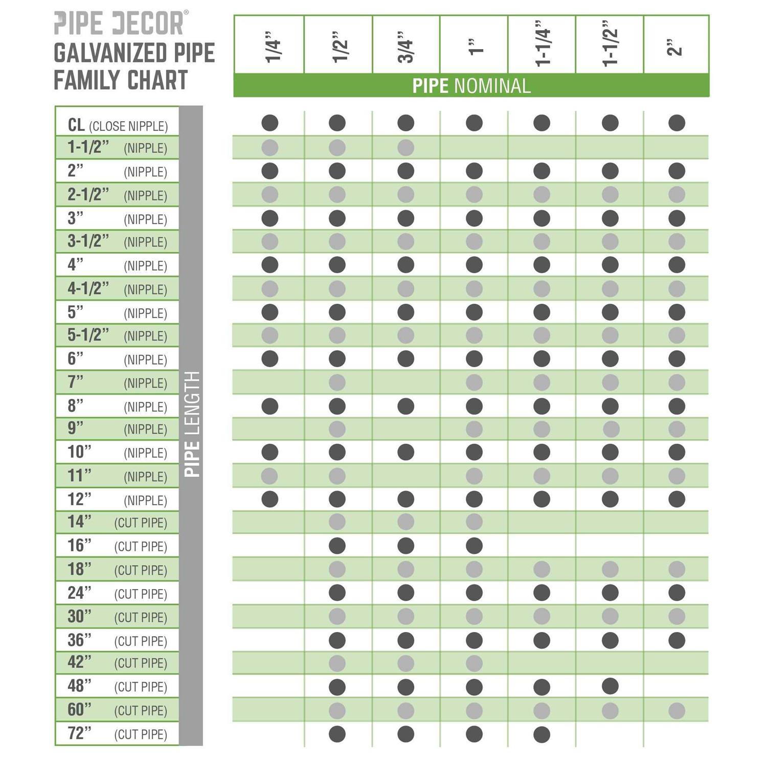 Galvanized Pipe – PIPE DECOR pre-cut pipe can be used for either plumbing or decor installations. This is genuine schedule 40 galvanized steel pipe that has been hydrostatically tested and is ASTM and ASME compliant. Each pipe comes pre-threaded and is free of any stickers. Quality industrial galvanized steel complements any aesthetic. These pipes are silver in color with a shiny finish that brings a clean, polished look to your pipe furniture. Our PIPE DECOR line contains an array of fittings and connectors to create a variety of projects. Build your own or use with our pipe kits to achieve a custom look. Galvanized pipes are corrosion-resistant and are perfect for creating DIY furniture without worrying about rusting Project-ready; no cleaning or sealing required before use Pipes complement a variety of looks and aesthetics, including steampunk lighting, industrial, factory, French country farmhouse, vintage, retro, reclamation, DIY customized, modern, and more IPS threads offer compatibility with other project materials such as lamp parts, valves, and more Compatible with any pipes, fittings, and PIPE DECOR furniture kits of the same diameter PIPE, PIPE DECOR, 1 1/4 in. x 72 in. Galvanized Pipe, pipes, steel pipes, black pipes, black steel pipes, piping, steel piping, black steel piping”