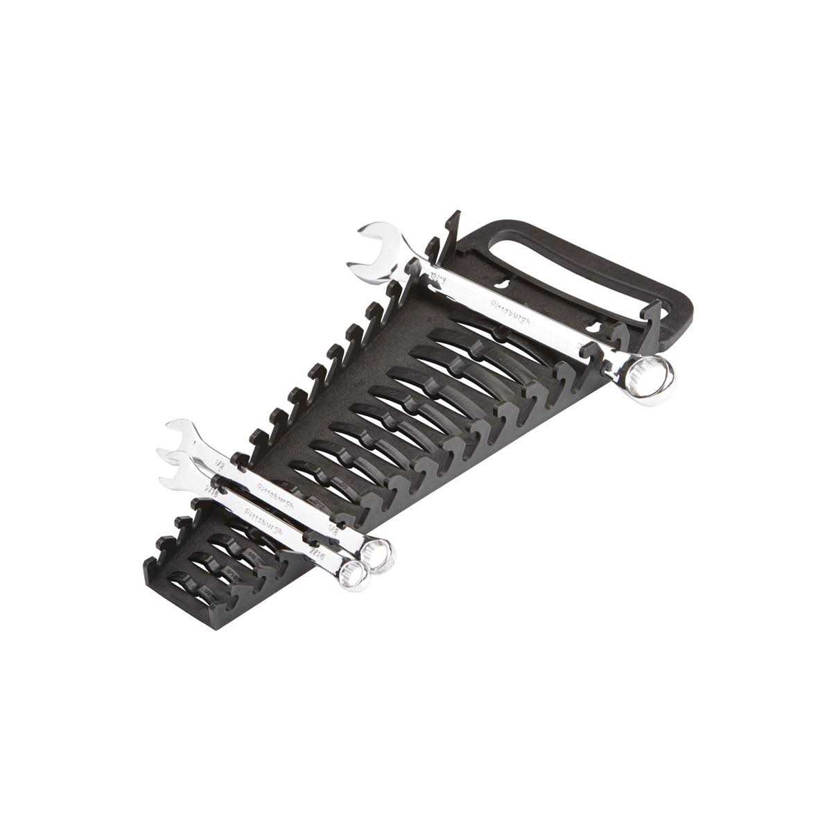 Organize your workbench and toolbox with this 16 slot wrench rack. The wrench rack features molded springs that lock your wrenches in place to keep them safe and at the ready. The wrench rack can hold open end, box or combo wrenches and is easily mounted to the wall or small enough to fit in your toolbox.