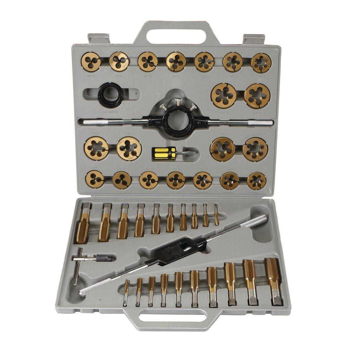 This 45 piece tap and die set includes the most-used thread sizes for every application. Titanium nitride coating extends life of the cutting edges on this tap and die set.