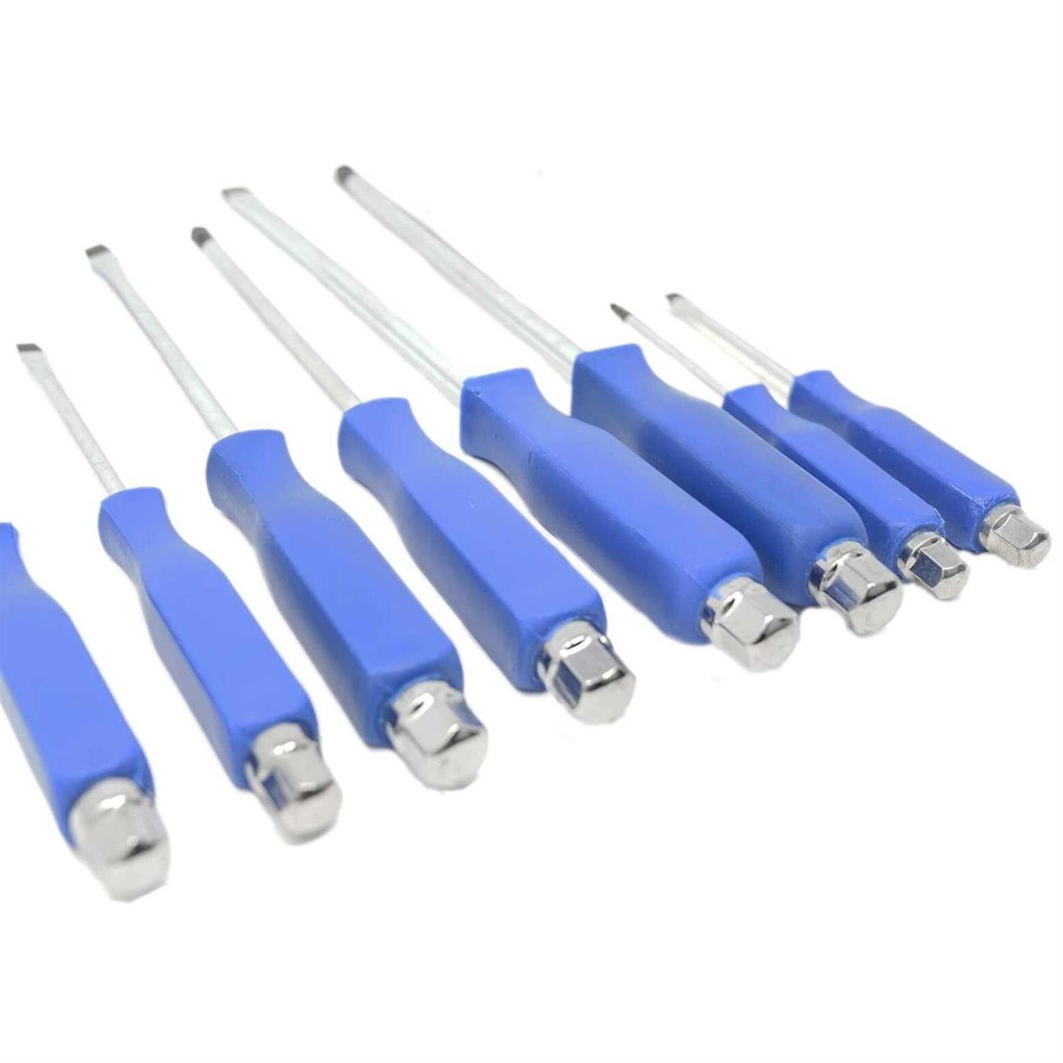 The screwdrivers in this 8 piece bolstered screwdriver set feature butt end hex bolsters for use with wrenches, nut drivers or even ratchets to develop maximum driving force. Oil-resistant handles and magnetic tips for added convenience.