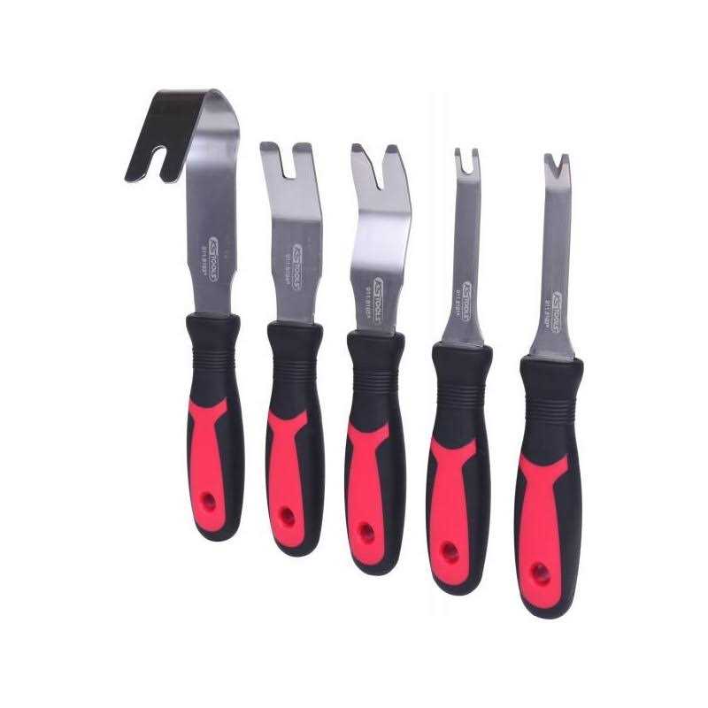 This upholstery tool set contains everything you need to remove door panels and more from your vehicle. The tool set features wide blades to reduce marring or damage to your vehicle during panel removal. With rubber handles and knurled grips for control and leverage, this upholstery tool set is ideal for the car enthusiast and auto body specialist alike!