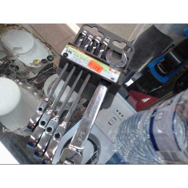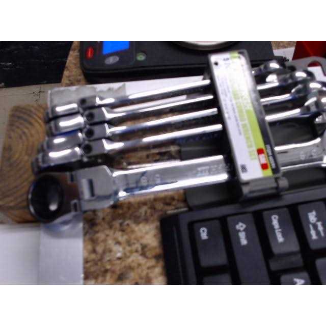 This ratcheting combination wrench set has flexible heads for working with fasteners in tight spots.