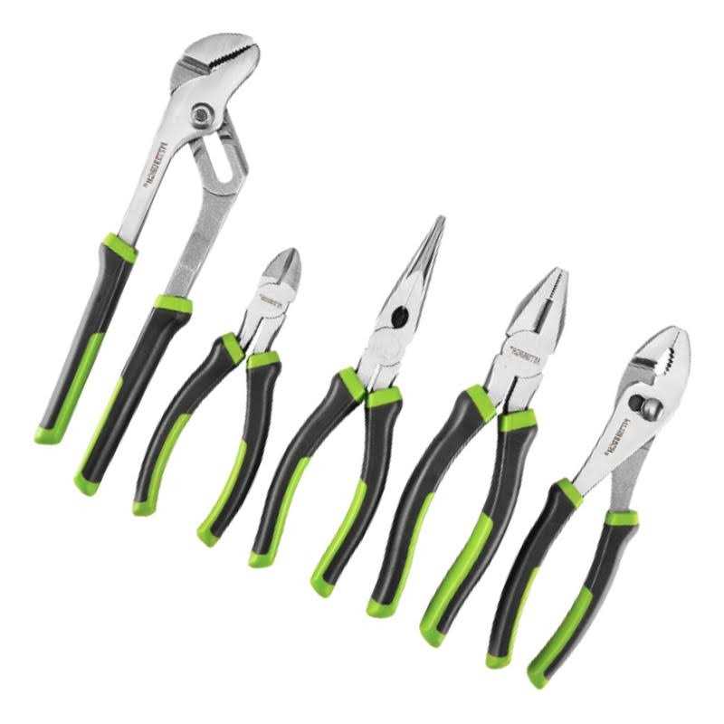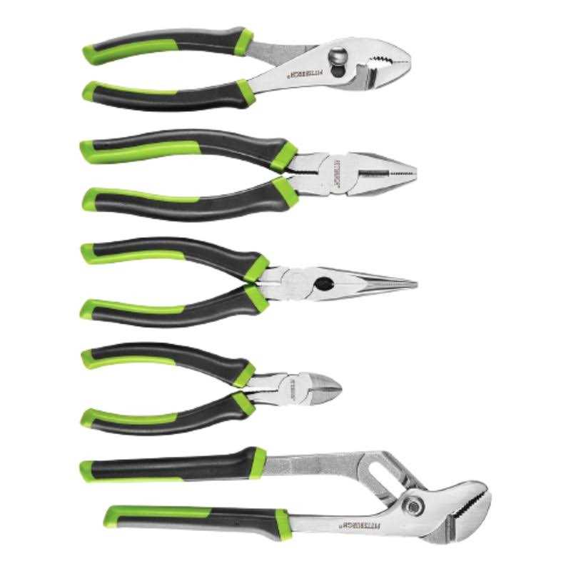 The, 5 Piece Pliers Set includes pliers for all types of jobs. This set of pliers is constructed of heavy duty forged and hardened steel with a polished finish. Comfort grips for a non-slip hold.