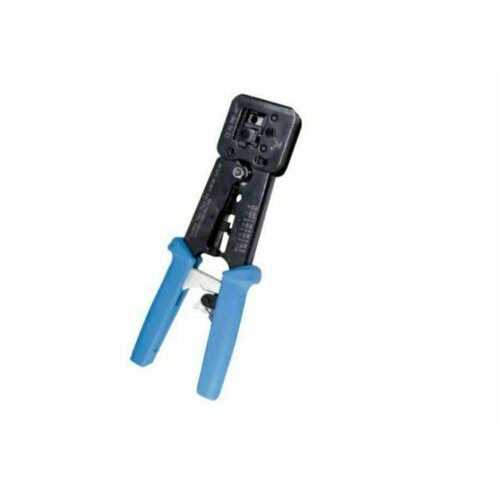 Crimp and trim wiring and cables with this Platinum Tools clamshell-style crimping tool. This tool is designed to handle large cables that are used in audio and visual communications as well as networking. It provides a ratcheted high-leverage platform for terminations. Ideal for large wire gauges and hard insulation around conductors it can also be used for separating splines. The crimps created by this tool are compliant with federal communications specifications. The comfortable ergonomic handles are padded and rubber-coated.