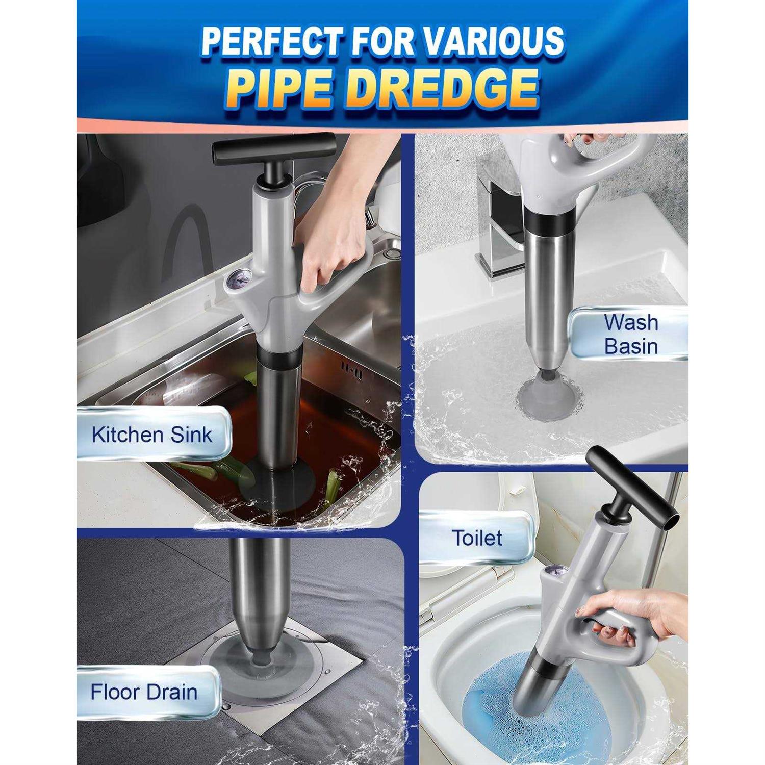 【High-pressure Design】Toilet Unblocking Tool adopts high pressure compressed air (up to 120PSI), which can easily unblock all kinds of debris such as hair, cloth, tea leaves, leaves, grease, oil, etc. – Faster and more effective than traditional manual sink plungers and toilet augers(Full charge takes 4-5 hours) 【Widely Application】Toilet Pipe Unclogger equipped with 4 different replacement heads, for bathroom, showers, kitchens, sinks, floor drains, blocked pipes, etc. – With the help of high pressure pneumatics, all kinds of blockages caused by rubbish, hair and cloth can be easily solved 【Real-Time Pressure Barometer】Air pressure indicator of drain blaster allow you to know the real-time pressure while you are inflating, more convenience to adjust according to different requirments (0-8Bar), avoiding splashing and damage caused by excessive force, and truly humanized design.( Note: If you found the barometer have no change when you inflating, please make sure the sealing ring fit tightly into the slot and the position direction is correct.) 【Say Bye To Expensive Plumber Fees】Toilet plunger heavy duty is perfectly ergonomic and easy to use. – The air plunger for toilet adopts non-slip ABS plastic handle and high quality stainless steel shell, anti-corrosion and wear-resistant, safer to use, can withstand high strength and high pressure, explosion-proof wall. No need to wait for a plumber and bear the expensive cost of unclogging, save your time and money! 【Blast Away The Clogged in Seconds】- The toilet plunger utilizes the power of high pressure compressed air to blast away the toughest blockages in the drain in seconds. Once inflated, you can easily unclog your pipes by pressing the button. – Quickly and more effective than traditional plungers, toilet snake and toilet auger! If a clogged toilet always irritates you, this toilet plunger will be a must for your bathroom! * The toilet plunger is a must-have tool for anyone who experiences frequent blockages in their pipes. /b br * Works by using high-pressure pneumatics to push through blockages caused by debris, hair, and cloth that are clogging the pipes. The pressure generated by the device helps to loosen and clear the blockage quickly and easily. /b br * It is easy to use, durable, and effective, and can save you time and money on expensive plumber visits. /b br * By using the different replacement heads, you can tackle a range of blockages in different areas of your home, making it a versatile and cost-effective solution. /b br br 【What You Will Get】 /b br 1 x Toilet Plunger /b br 4 x Plunger Heads /b br 1 x Inflatable Base /b br 1 x Converter /b br 1 x Storage Device /b br 1 x User Manual /b br (Splash-proof Tips: Cover the opening of the toilet with plastic wrap, only need to leave a gap to put in the toilet plunger, directly tear off the plastic wrap after use and rinse the unclogger with water.) /b br br Achieve better results when unclogging by following these tips: /b br Tilt the air plunger at a 45 degree angle to ensure a proper seal with the wall of the toilet /b br For semi-blocked pipelines, put some toilet paper sundries to make a fuller blockage /b br br How to use the toilet plunger? /b br Step 1:Install the toilet plunger. (If the first time cannot be unblocked, it can be repeated several times.) /b br br