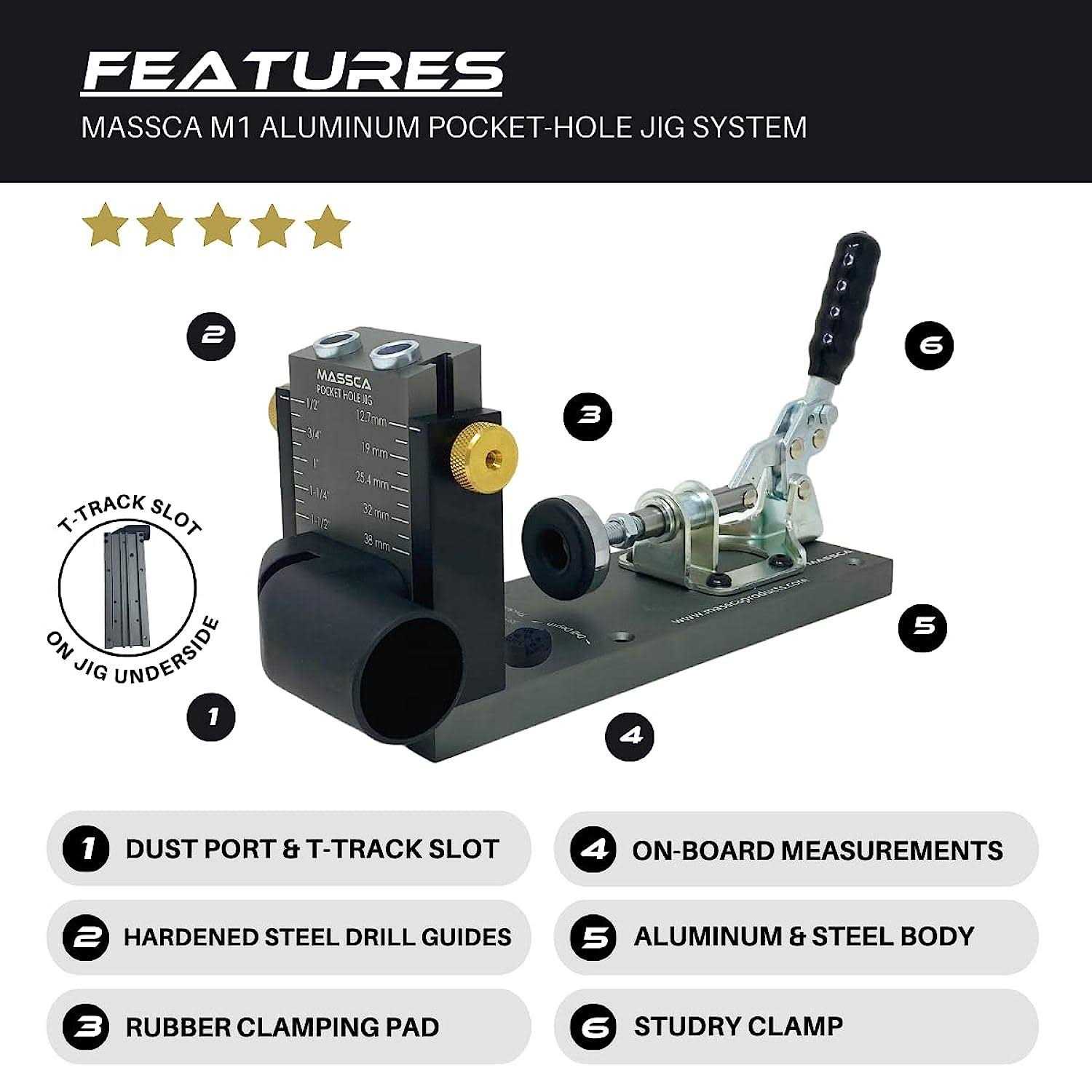 Pocket Hole Jig Kit M1 – Adjustable & Easy To Use Pocket Screw Jig – Heavy Duty Drill Jig For Angled Holes With Drill Bit, Pocket Self Tapping Screws &Driver Bit,Item Condition: NewProduct Dimension: 10.8 X 4.6 X 5.31Product Information Advanced Hole Precision Create Perfect Woodworking Holes, Repair Wood Joints, And Accurately Pre-Drill Pilot Holes At The Right Angle Before Connecting Wood Boards. Adjustable Depth Setting Each Pocket Hole Jig Kit Features An Easy Drill Depth Knob To Let Quickly Adjust To The Thickness Of The Wood To Avoid Damage, Splinters, Or Splits. Extra Carpentry Accessories WeVe Added A Hex Key, Stop Collar, Set Of Screws And Drill Bit To Help Set The Right Depth, Make A Few Choice Jig Holes, And Start Creating Diy Projects. Heavy-Duty Aluminum Body The Pocket Hole Jig Set Uses A Well-Balanced Aluminum Frame To Ensure A Reliable Wo