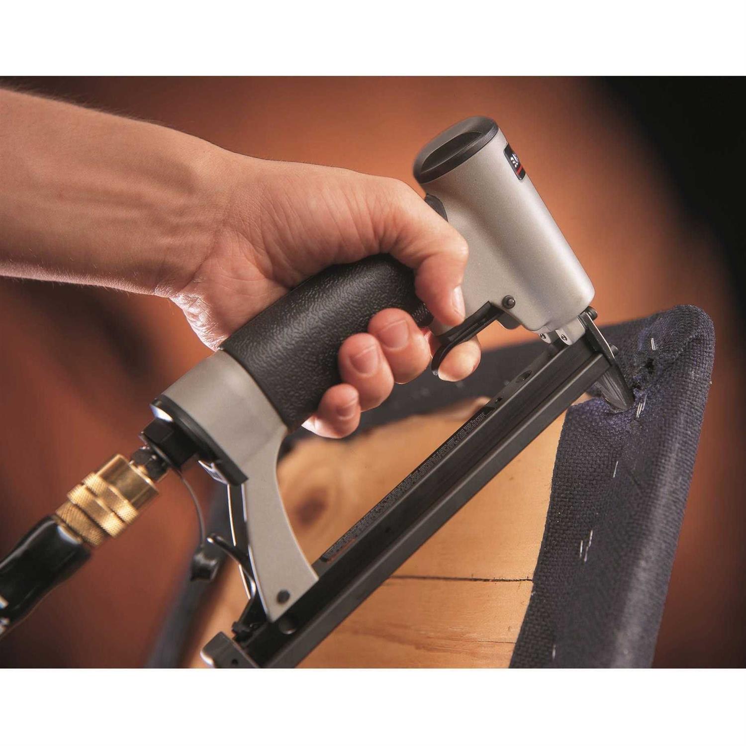 It uses standard Senco C Type 22-gauge 3/8-inch crown staples to get the job done right and it includes a 1-inch nose extension for those tough to reach areas. The high-capacity bottom-load magazine handles 185 staples and the driver guide moves back to easily clear jams from the magazine. The US58 stapler requires 70-120 PSI air pressure so it will work with most air compressors.